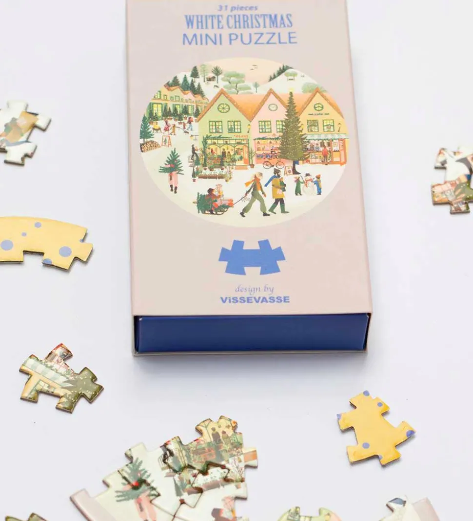 Sjovt Vissevasse puslespil i rolige farver, med et motiv af en hyggelig by i juletiden.