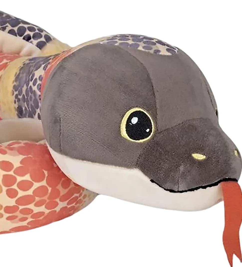 Sej Wild Republic bamse formet som en slange i beige, brune, røde og gule nuancer. Wild Republic bamsen har et sødt ansigt med en rød tunge. Den er meget blød at kramme og lege med.
