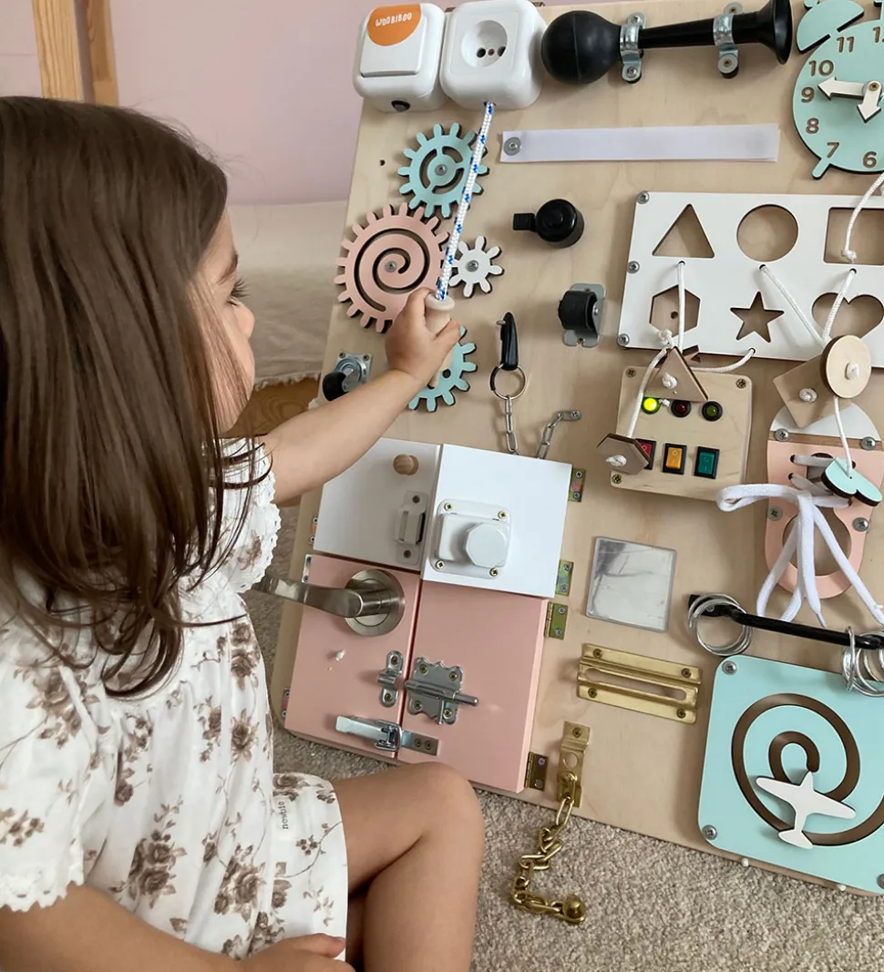 Woobiboo Woobiboardet er en aktivitetstavle, som kombinerer læring og leg. Den er designet til at vække barnets nysgerrighed og gennem leg styrke en række færdigheder. Woobiboardet styrker motorikken og logisk tænkning samt barnets uafhængighed, tålmodighed og psykomotoriske færdigheder. Woobiboardet rummer følgende aktiviteter: