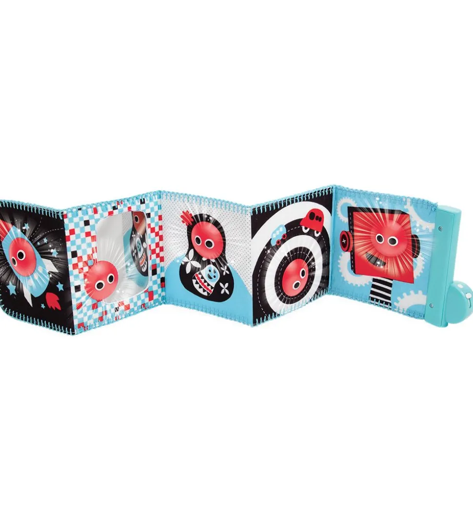 Yookidoo bogen består af ti sider, alle med et ansigt som kan lyse op. Ansigterne lyser op i rækkefølge, som er med til at styrke barnets reflekser og promoverer bevægelse. Bogen kan spille to klassiske, beroligende melodier og på den ene side er der et stort babyspejl, som ikke kan splintre.