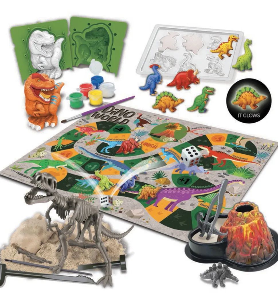 4M dino sættet indeholder en udgravning med et dinosaur skelet, et dinosaur spil, en vulkan med kviksand, et 3D dinosaur støbe- og malesæt, og et sæt til at støbe og male køleskabsmagneter, som lyser i mørket. Dino sættet er en sjov og lærerig oplevelse for de små, og er med til at styrke videnskab, teknologi, engineering, kunst og matematik (STEAM – Science, Technology, Engineering, Art, Maths).