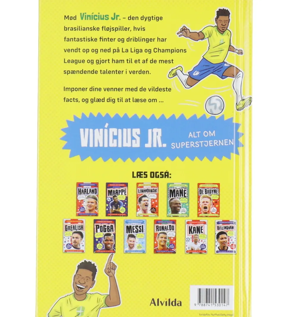 Interessant Alvilda bog i en levende gul med et iøjnefaldende billede af Vinícius Jr. på forsiden. Alvilda bogen indeholder alle spændende detaljer om fodboldstjernen og hans største øjeblikke.
