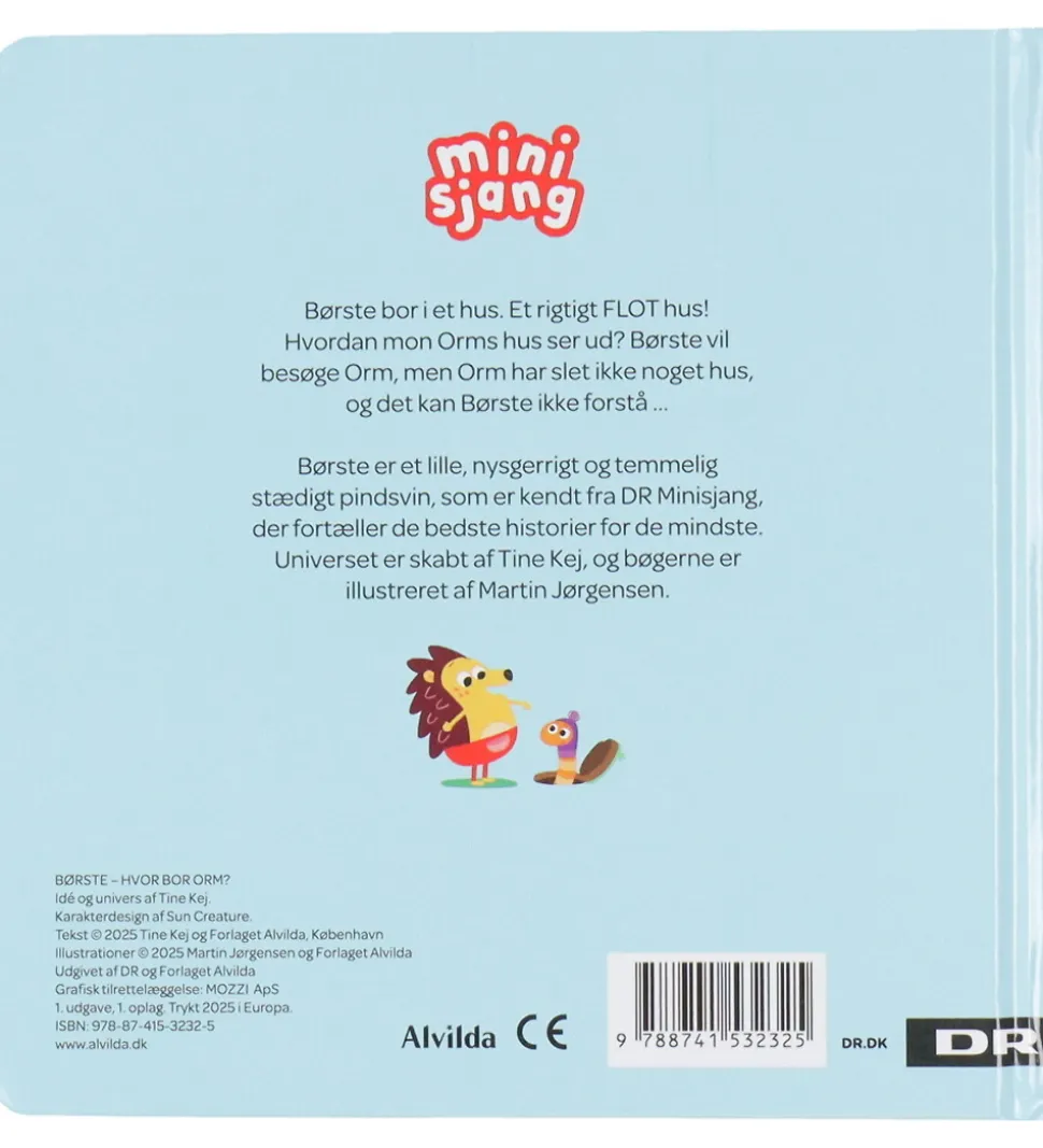 Farverig Alvilda bog med et spændende motiv af Børste og Orm på den lyseblå forside. Alvilda bogen byder på en underholdende fortælling, om Børste der vil finde ud af hvor Orm bor henne.