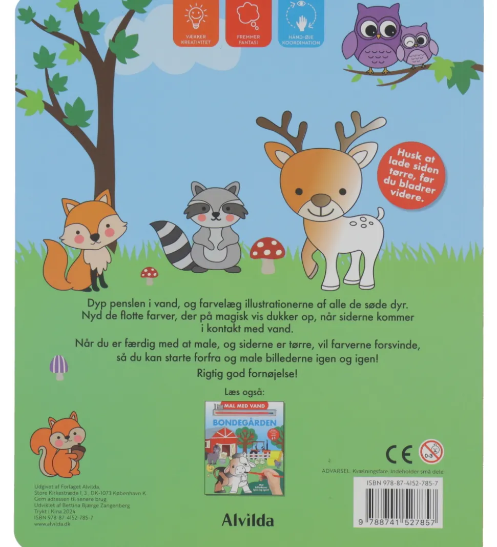 Sjov Alvilda malebog “Søde dyr – Mal med vand” med medfølgende pensel.