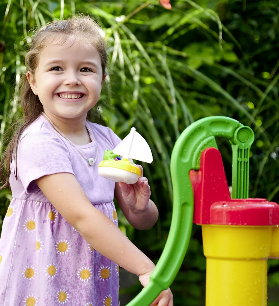 AquaPlay vandbanen har fire ben, så mindre børn kan stå op og lege med vand. I midten er der en stor svamp med møllehjul, og man kan lave sjove vandfald på den. I den anden side er der en stor vandpumpe, som kan pumpe vandet ned over de sejlende både eller ned i en spand.