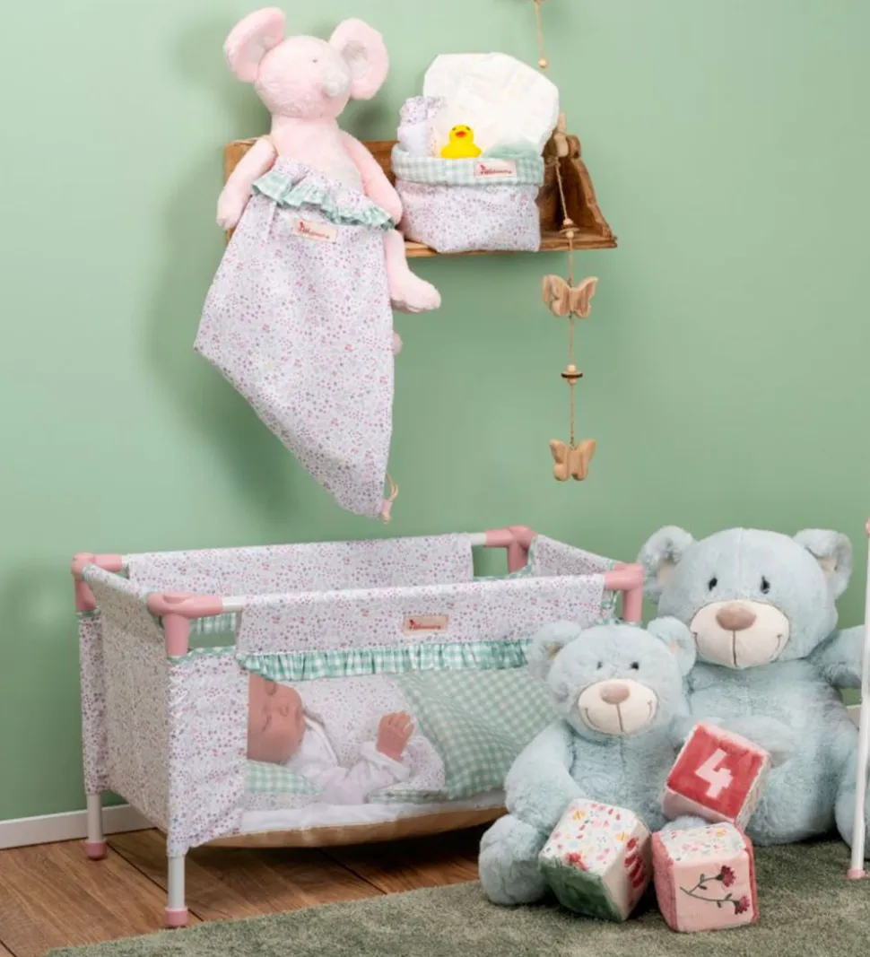 Sødt Asi dukketilbehør i form af en rejseseng i hvid med et blomstret design i rosa og grønne farver samt med detaljer med grønne tern.