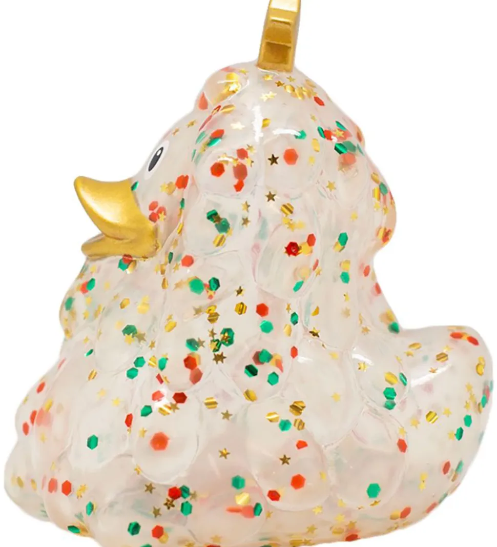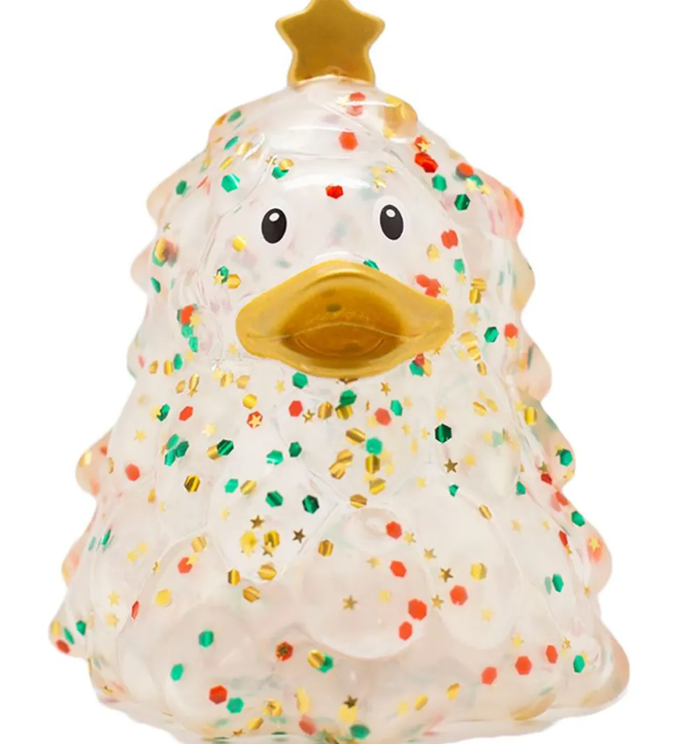 Sjov badeand som ligner et juletræ med multifarvet glimmer og en guld stjerne på toppen.