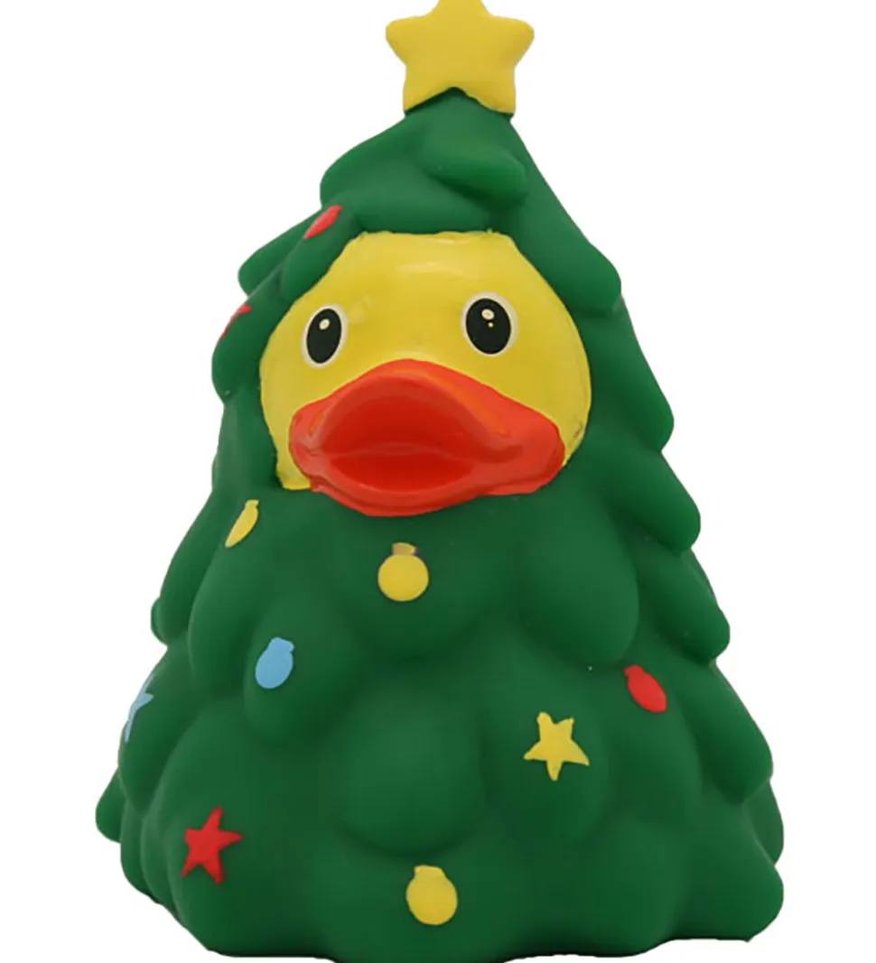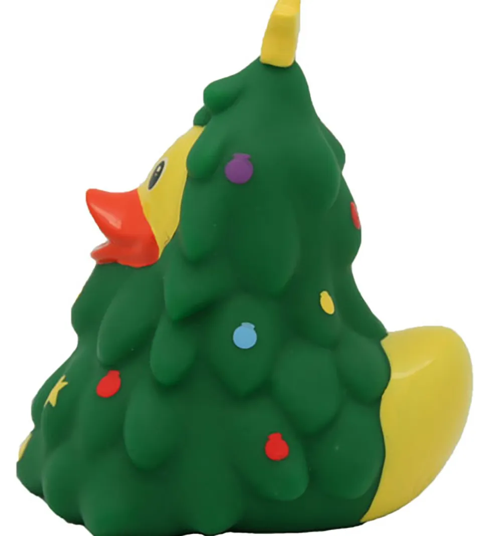 Sød badeand i gul med et juletræ kostume.