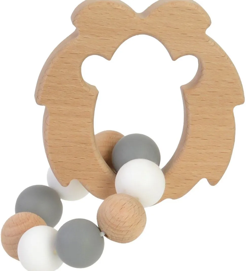 Skøn BAMBAM rangle i træ formet som en løve samt perler i træ og silikone i grå og hvid.