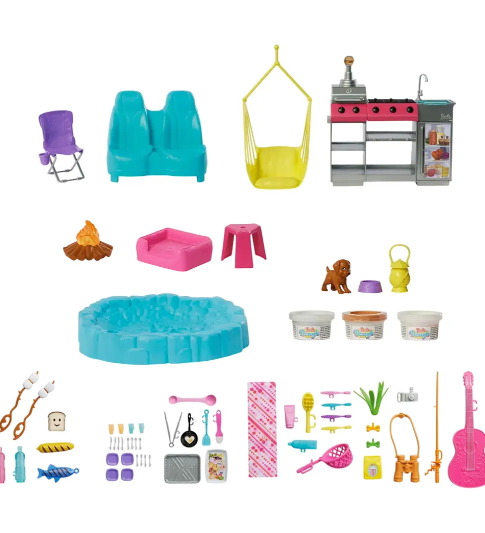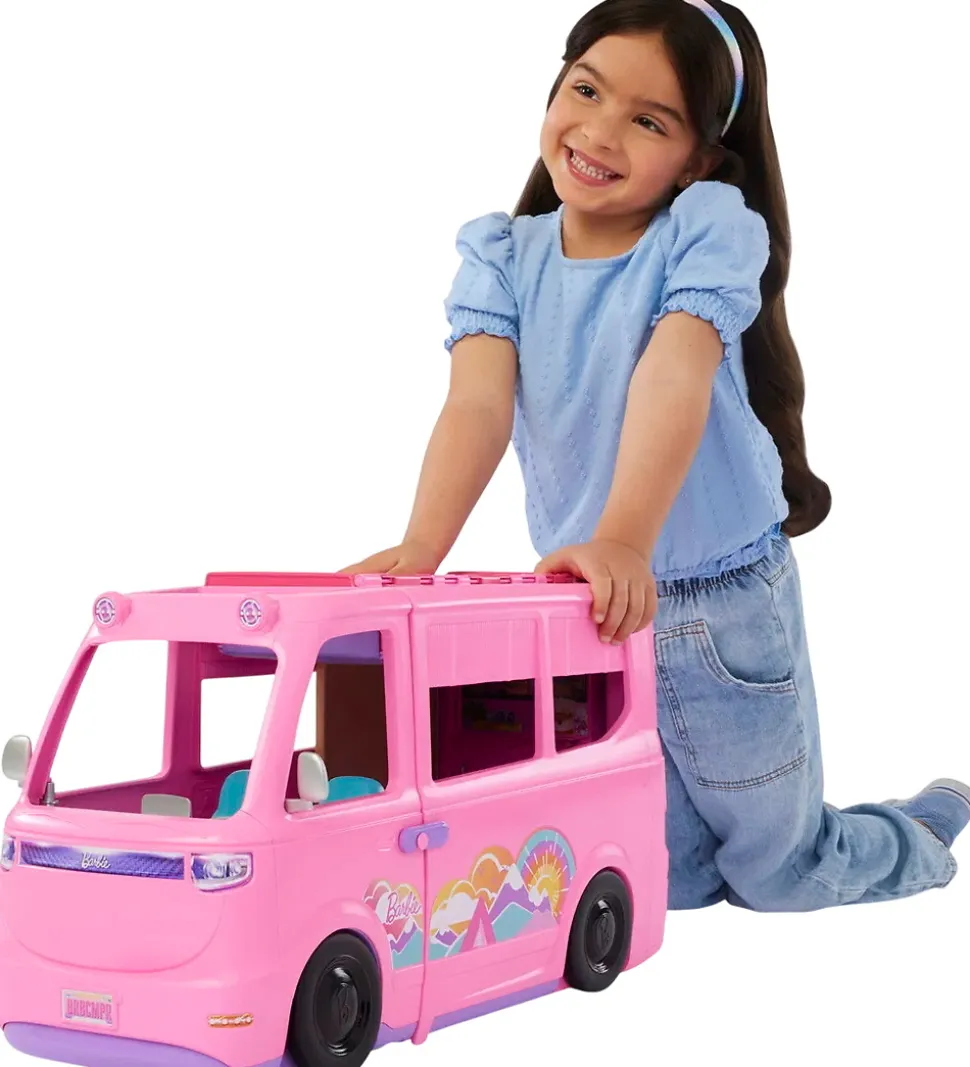 Fantastisk Barbie legetøj i form af en pink autocamper og en masse tilbehør. Legetøjet består af mere end 60 dele, så dukkerne kan lave mad, fiske, sove og meget mere på deres campingtur. Barbie legetøjet har mange fine detaljer og indbyder til fantasifulde lege.