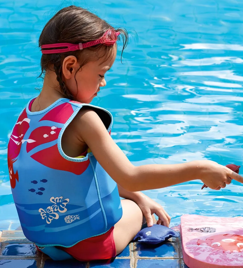 Svømmevesten er lavet af neopren med skum indvendigt, så det kan holde barnet op til vandoverfladen.