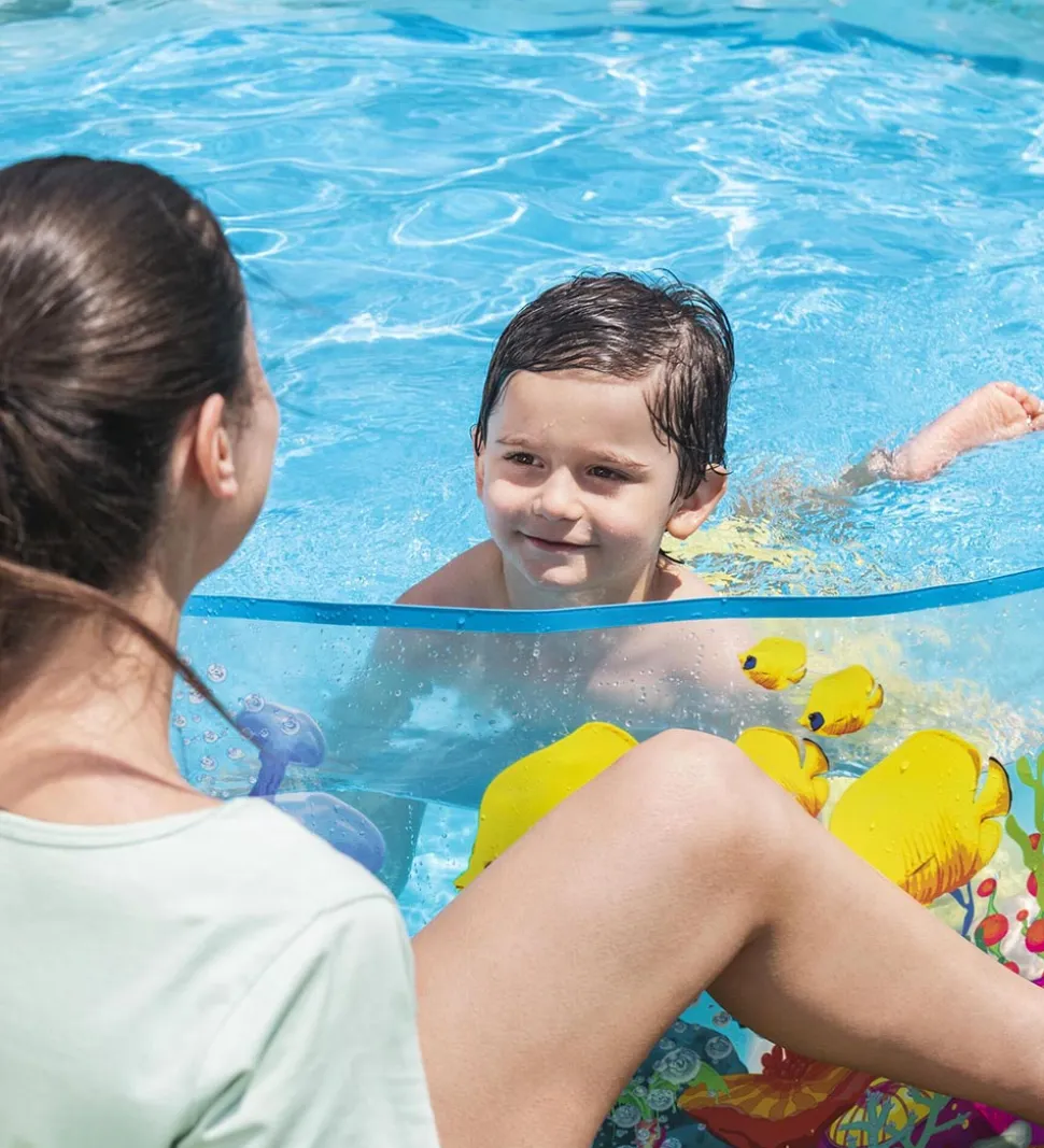 Fin Bestway badebassin i transparent med et print af forskellige fisk, delfiner, hvaler og havplanter.