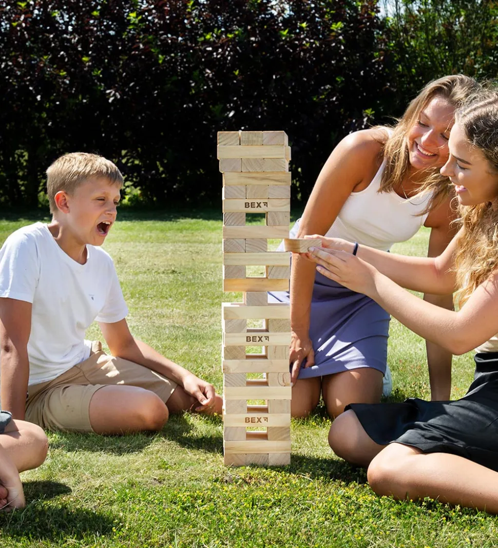 Bex Sport havespillet går ud på at bygge et tårn og så fjerne én klods ad gangen, indtil tårnet vælter. Det gælder om at være den, der ikke vælter tårnet. Havespillet er sjovt og socialt at spille for hele familien.