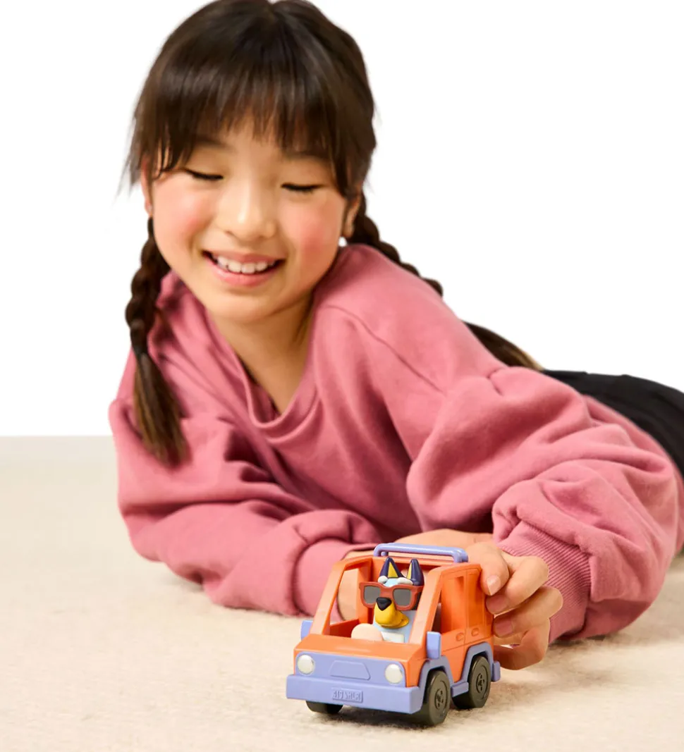 Sej Bluey bil og figur bestående af en 4WD og Bluey med solbriller på. Bluey har et bevægeligt led, så den både kan stå og sidde. Sættet bidrager til fantasifulde lege, hvor man kan bringe scener fra tegneserien til live i legen.