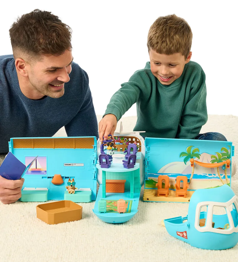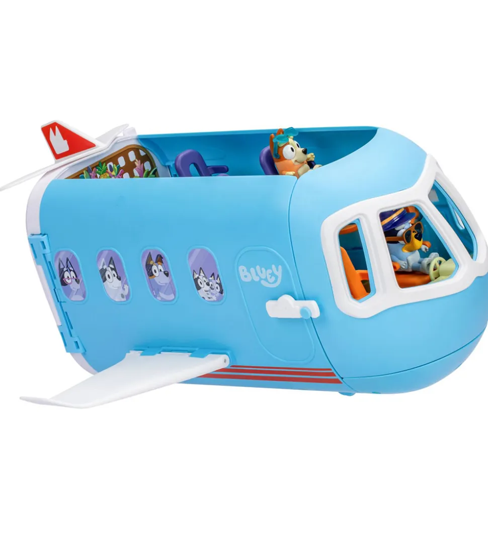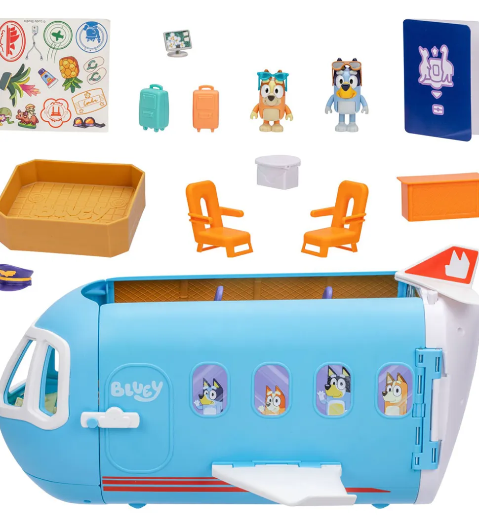 Bluey legesættet rummer figurer af Bluey og Bingo samt den transformerbare flyvemaskine, som rummer et væld af sjove legefunktioner. Flyvemaskinen kan nemlig både være en samlet flyvemaskine eller foldes ud til et ferieparadis med flere sektioner eller cockpittet kan omdannes til en båd.