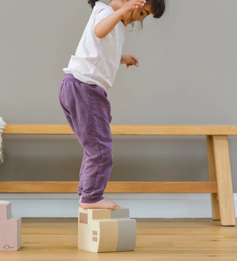 bObles tumlemøblet er dekoreret som et hus, og det er fladt i bunden, og i toppen er det buet. Det kan bruges som en lille skammel, eller som en del i tumlelege eller balancelege, og sammen med de andre figurer i serien kan man bygge sin egen by. Så er der lagt op til at slippe fantasien løs og udfordre motorikken.