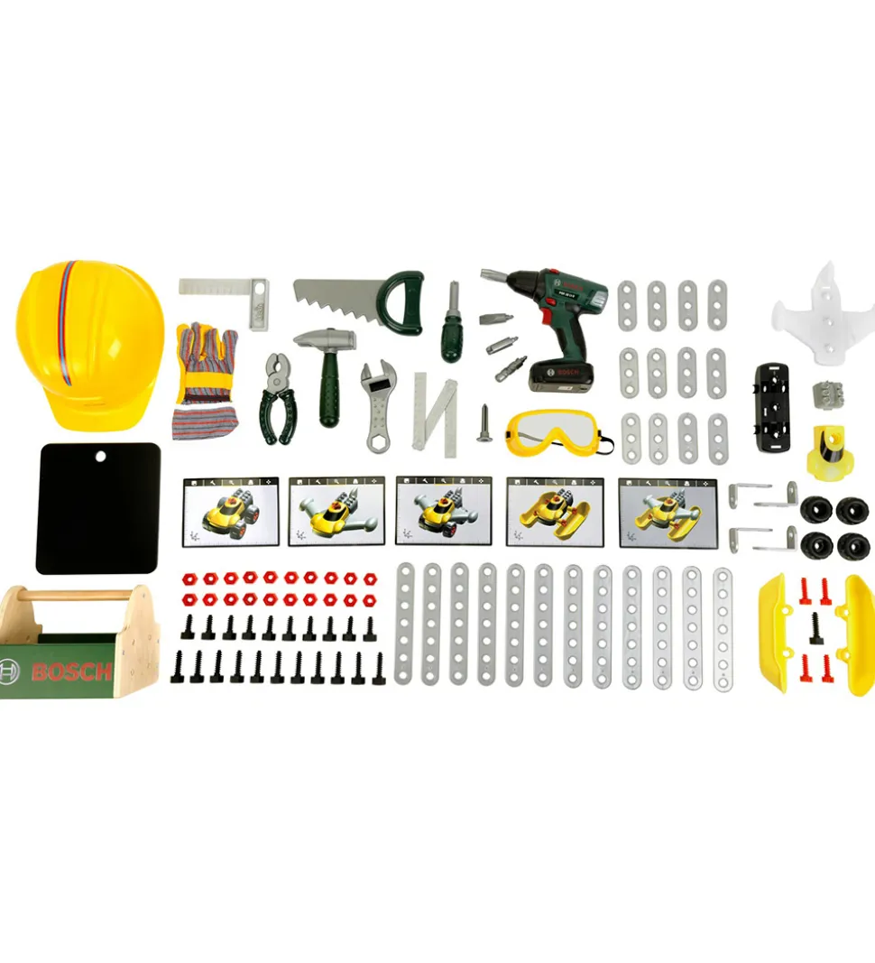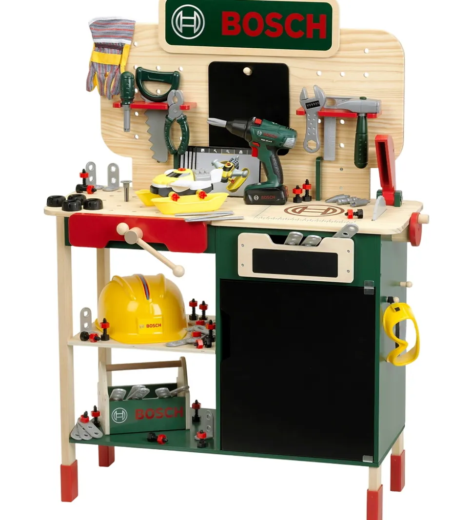 Fantastisk Bosch Mini snedker værktøjsbord i træfarvet, grøn og rød. Værktøjsbordet inkluderer mange dele, heriblandt forskelligt værktøj, beskyttelseshjelm, værktøjskasse og arbejdshandsker. Der medfølger en batteridrevet Bosch akku-skruetrækker og en mekanisk rundsav med lyd, som gør legen endnu mere virkelig. Værktøjsbordet har en masse kroge til værktøjet og plads til at bygge ligesom en rigtig håndværker. Bosch værktøjsbordet stimulerer barnets fantasi og kreativitet.