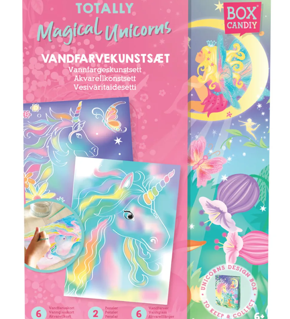 Spændende BOX CANDIY kreasæt i form af dette vandfarvekunstsæt med temaet “Totally Magical Unicorns”.