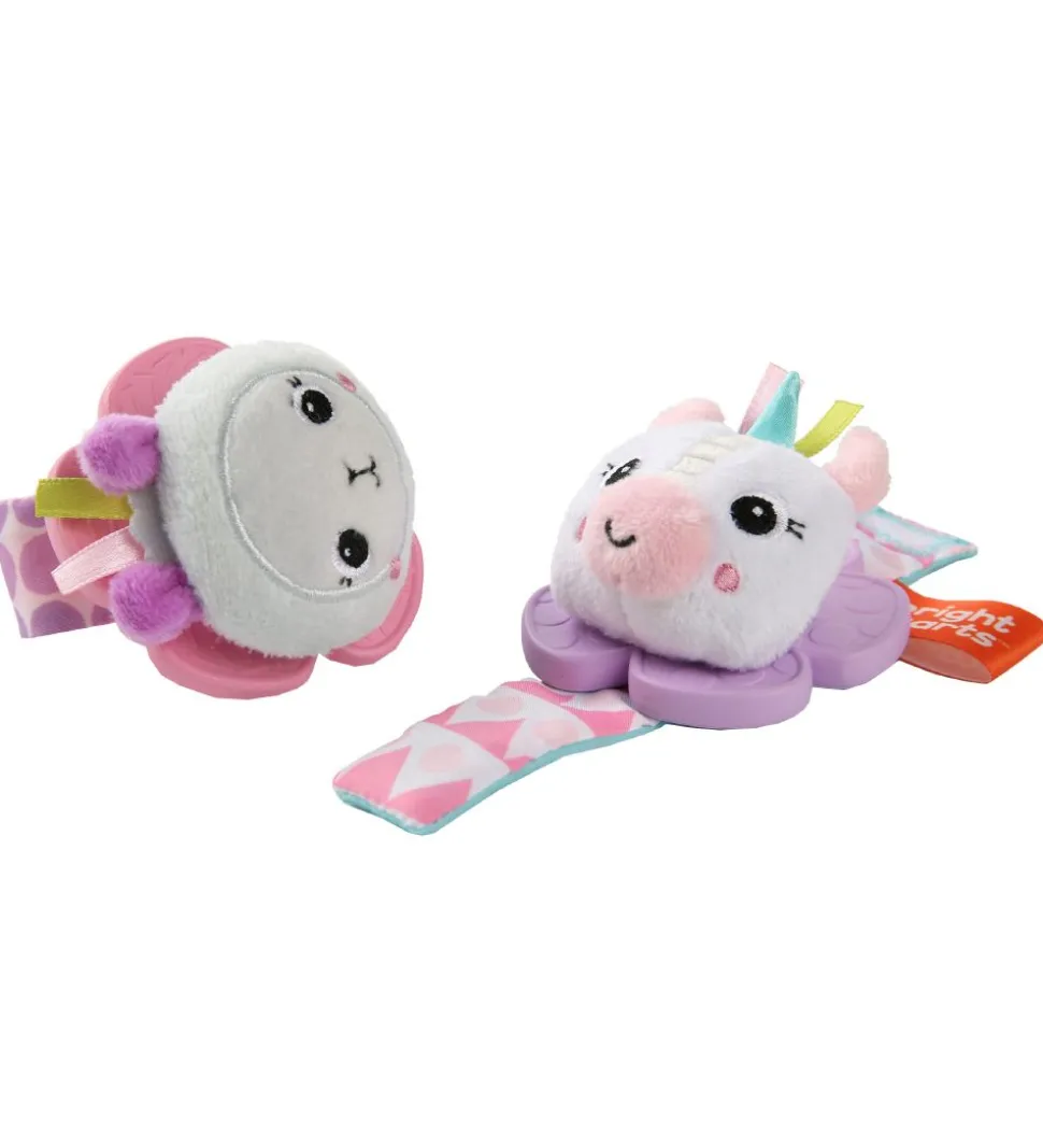 Yndige Bright Starts biderangler solgt i en 2-pak i lilla og rosa nuancer som forestiller en enhjørning og en lama.