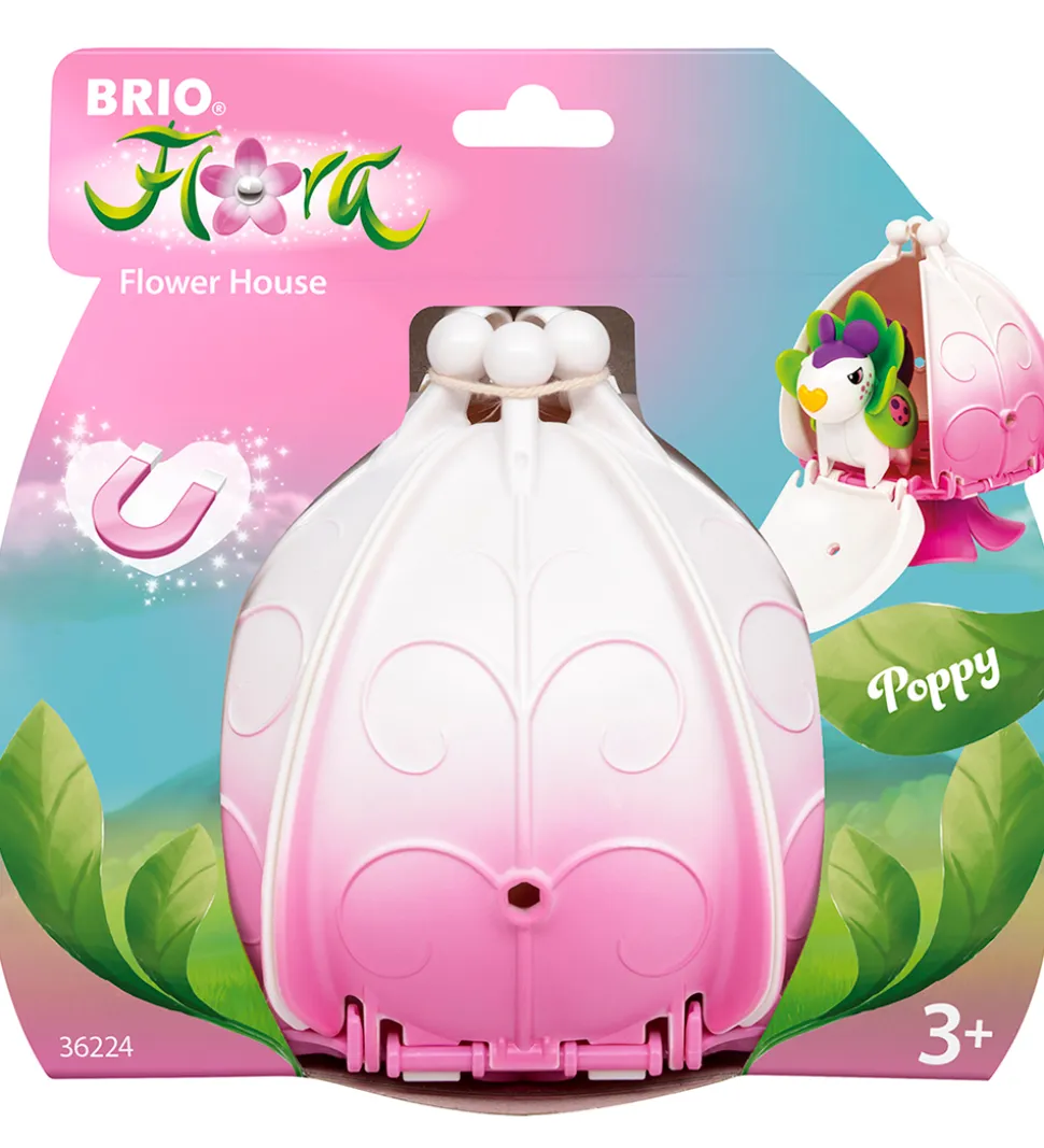 Sødt BRIO Flora blomsterhus i en flot kombination af hvid og rosa, og med figuren Poppy. Huset er formet som en stor blomst og gemmer på et farverigt sted, hvor Poppy kan lege og gå på opdagelse. Med den søde bladkappe og magiske næse er Poppy klar til at samle blomster og møde sine venner i Flora-universet.