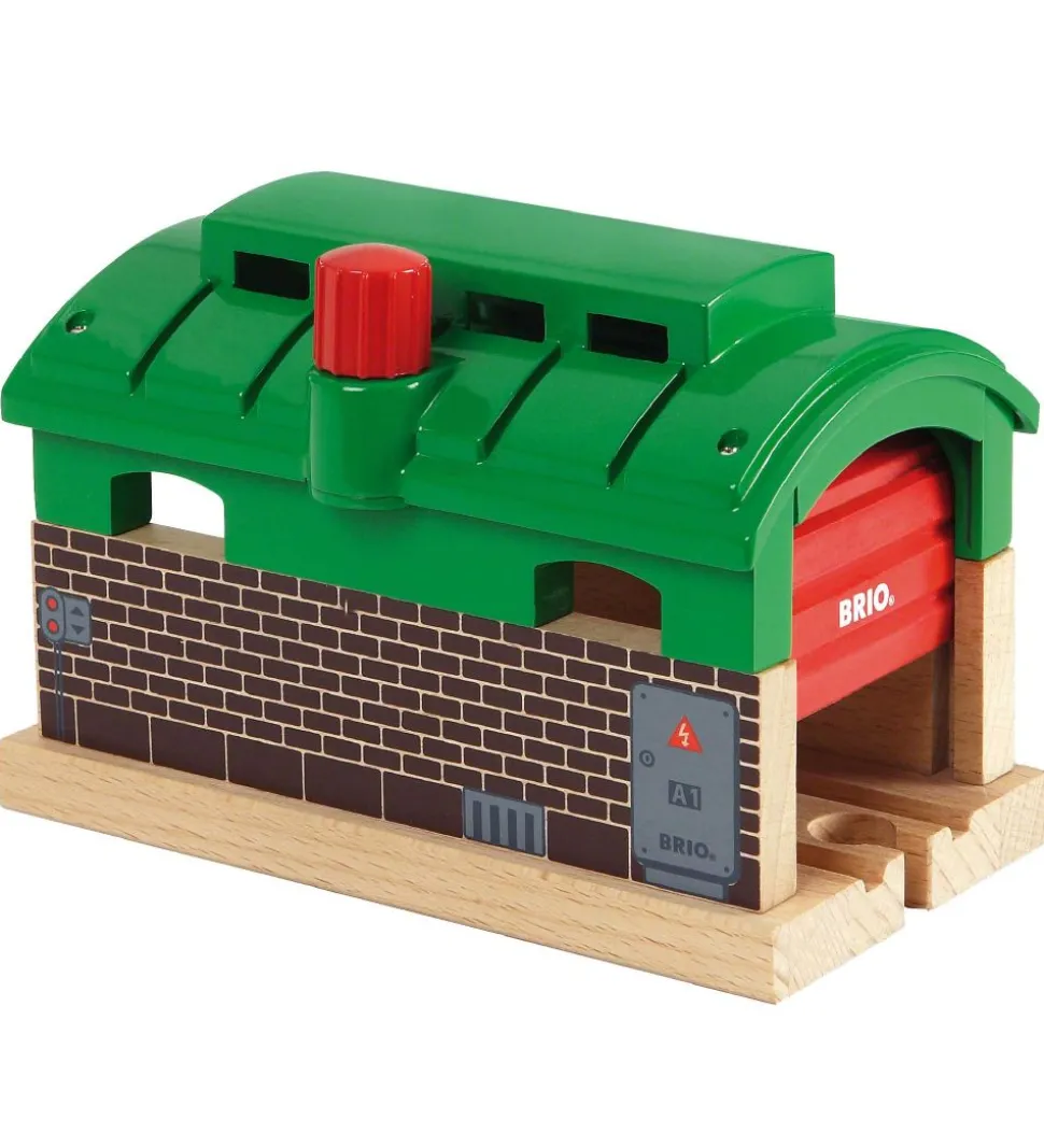 BRIO toggaragen kan løfte porten ved at dreje på håndtaget. Med døren åben fungerer denne garage også som en tunnel. Toggaragen byder på mange timers leg og er en sjov udvidelse til togbanen.