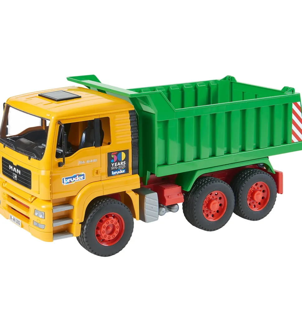 Flot Bruder lastbil, der er en realistisk model af en Man TGA lastbil med tippelad. Lastbilen er i et grønt og gult farvetema og fremstår fuldstændig som den ægte vare i størrelsesforholdet 1:16.