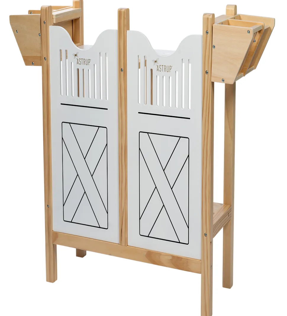 by ASTRUP hesteboksen har en robust konstruktion og giver mulighed for at samle flere kæpheste på ét sted. Hesteboksen har to udhæng med plads til foder til hestene. Hesteboksen er et godt hjem til kæphestene, hvor de kan stå og spise og blive plejet.