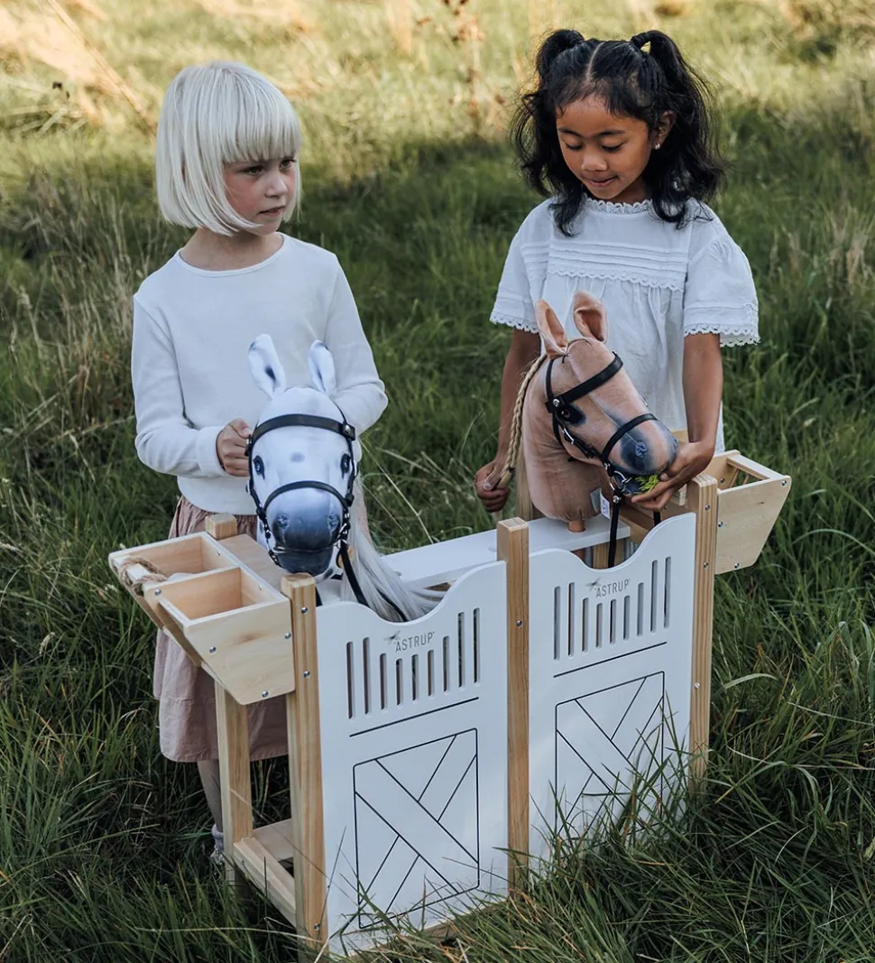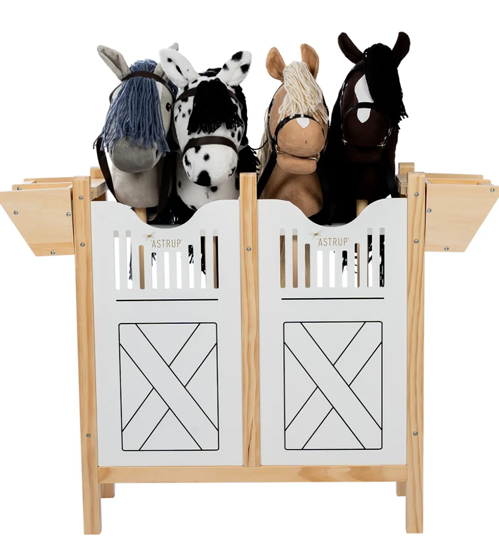 Sjov by ASTRUP hesteboks med plads til fire hæpheste i krydsfiner med en front i hvid med fine detaljer.