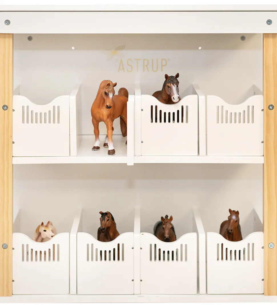 by ASTRUP hestebokse til væg består af otte små hestebokse med låger, der kan åbnes og lukkes. Den monteres på væggen og kan bruges til opbevaring af f.eks. Schleich legetøjsdyr, men også bare som en ganske almindelig hylde på børneværelset.