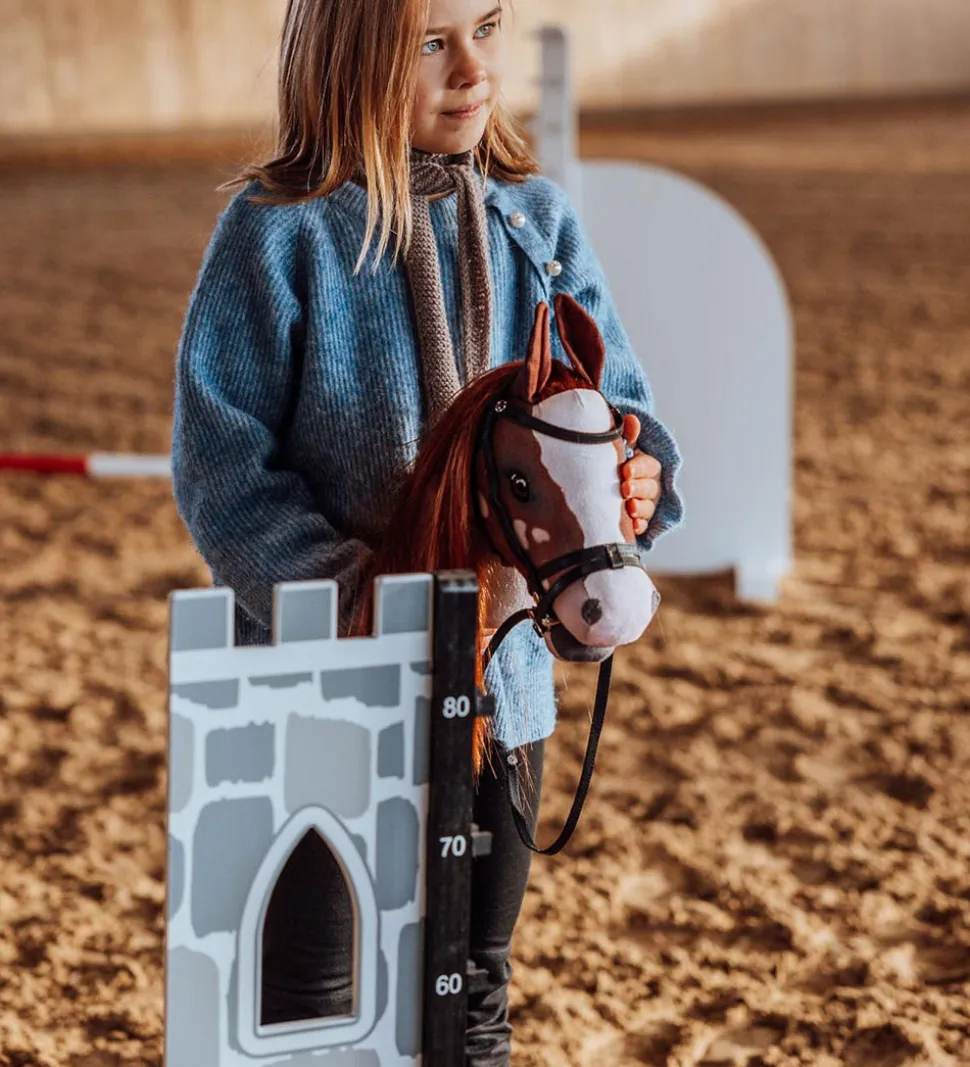 Sjovt by ASTRUP spring til kæphest i træ som ligner en ridderborg, med en bom i hvid træ med grå striber. Der medfølger en lille væg, som kan placeres under bommen.