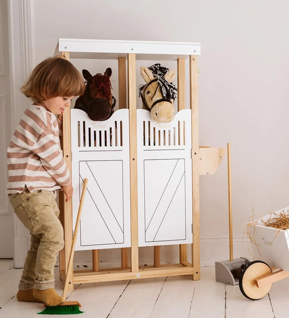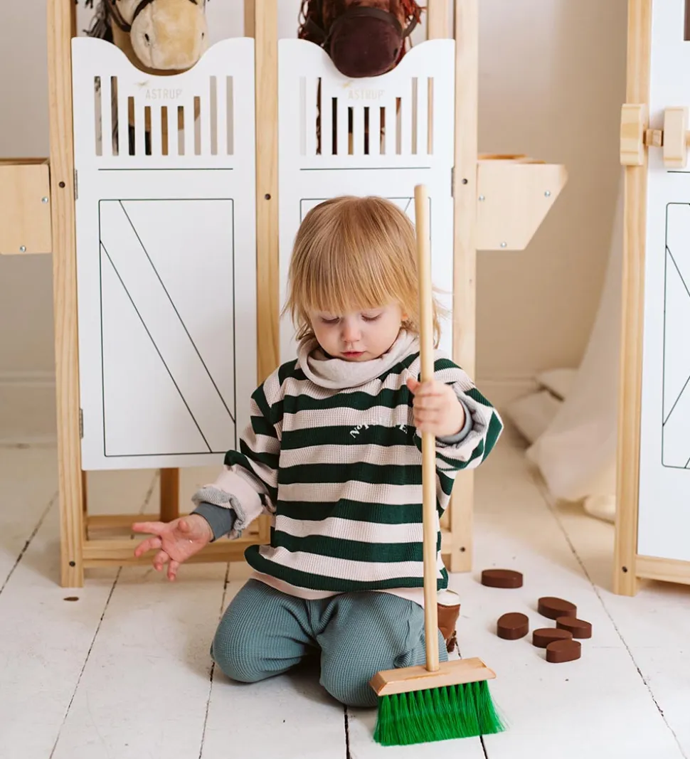 by ASTRUP staldsættet er med til at gøre legen med kæpheste ekstra virkelighedstro. Staldsættet indeholder alt det nødvendige til at holde kæphestenes stald ren.