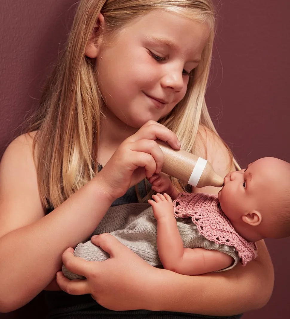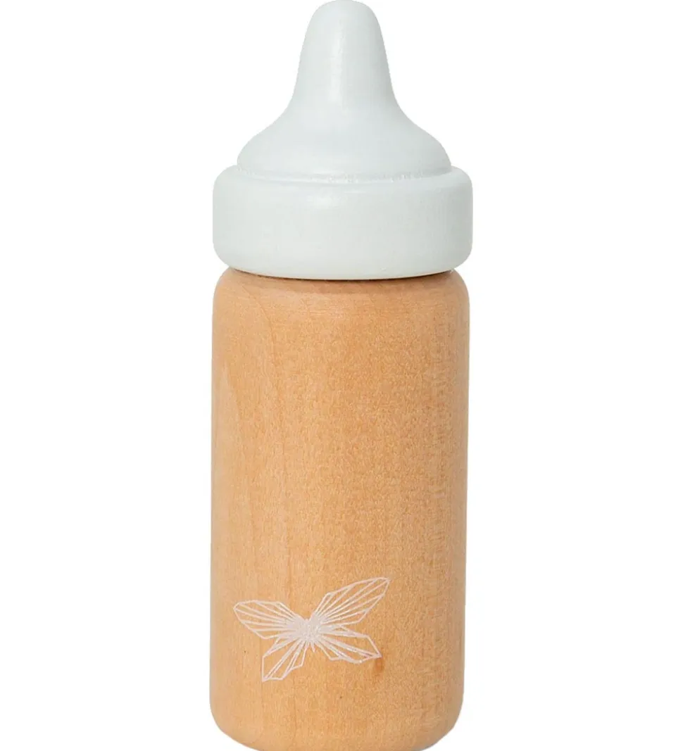 Smart by ASTRUP sutteflaske i naturlig træ, med en hvid top. På den ene side er der hvide målestreger og på den anden er der et hvidt logo. Sutteflasken er en god tilføjelse til legen og er med til at styrke barnets kreativitet.