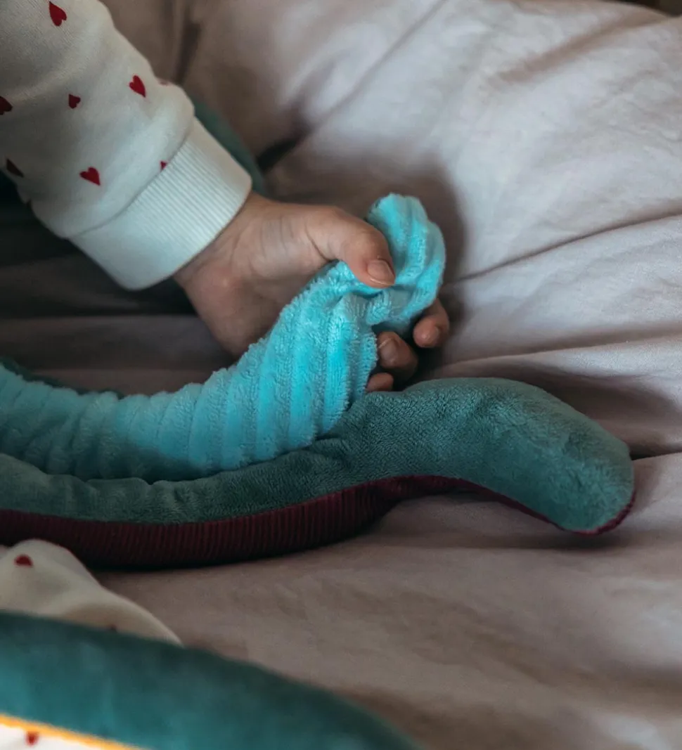 Skøn by Astrup bamse formet som en aquagrøn blæksprutte, og undersiden af dens ben er lavet af forskellige materialer med sjove strukturer og i klare farver.