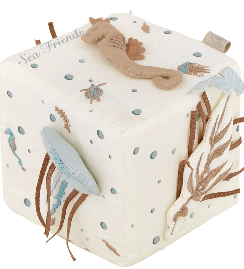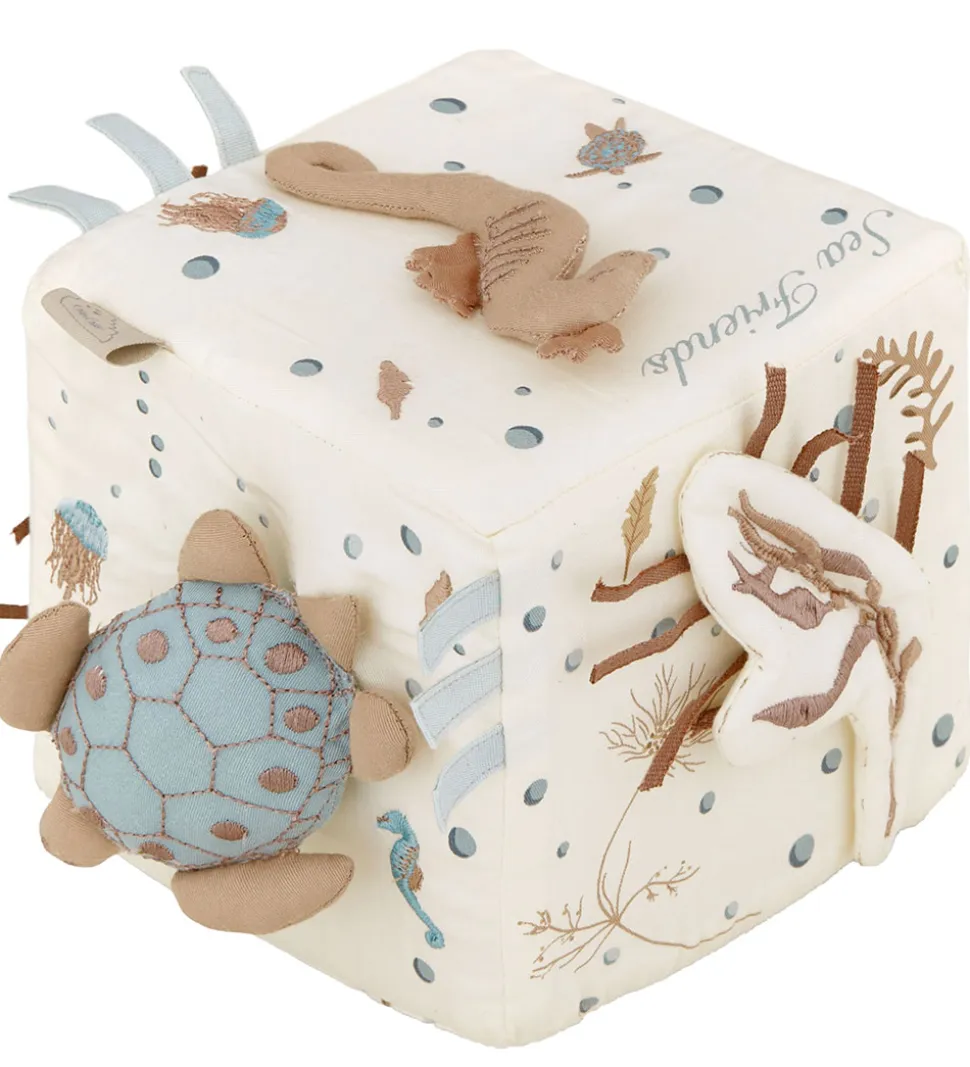 Cam Cam Copenhagen aktivitetslegetøjet har form som en terning, og de forskellige dekorationer er sjove for det lille barn at udforske. Der er detaljer, som knitrer, andre rasler, og der gemmer sig også et lille spejl. Terningen er lavet i en blød bomuldskvalitet med et blødt fyld, og den er sjov for de små at trille rundt på gulvet.