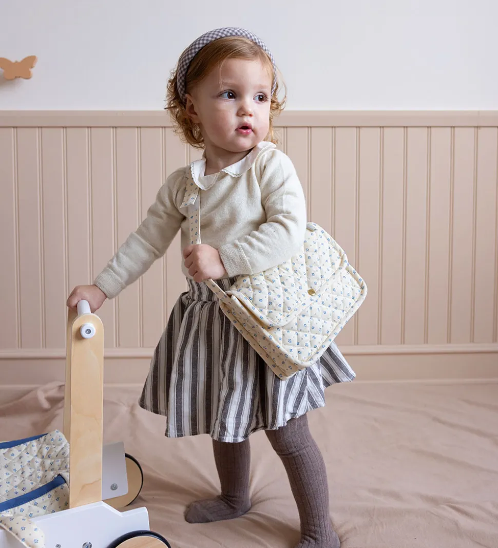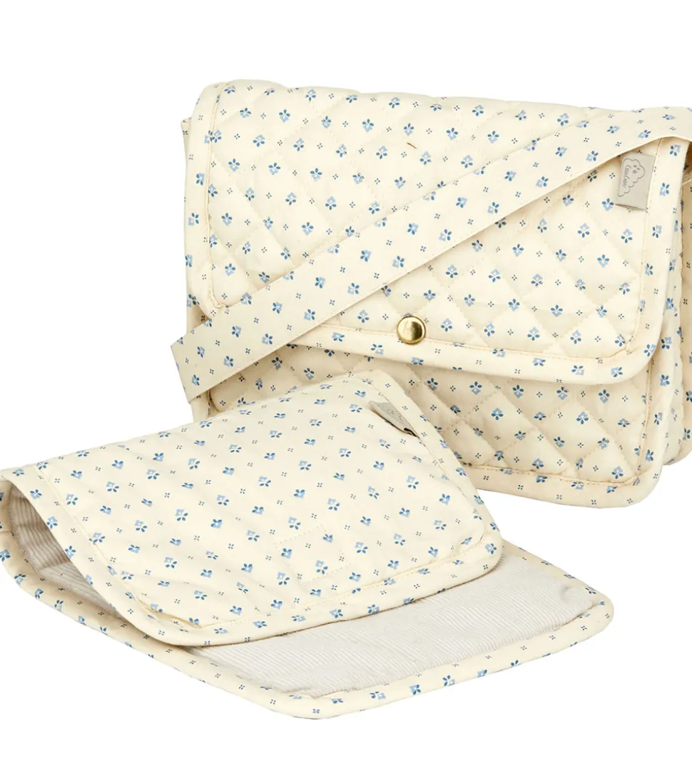 Flot Cam Cam Copenhagen pusletaske til dukker i beige med et alloverprint af fine, små blomster i blå nuancer. Pusletasken har en quilted struktur.