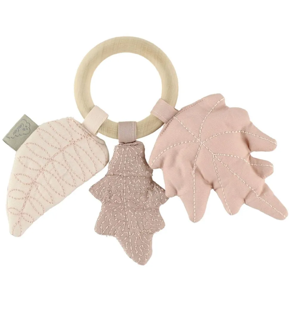 Skøn Cam Cam Copenhagen rangle i lyst træ og med tre blade i forskellige rosa nuancer, med flotte broderede detaljer.