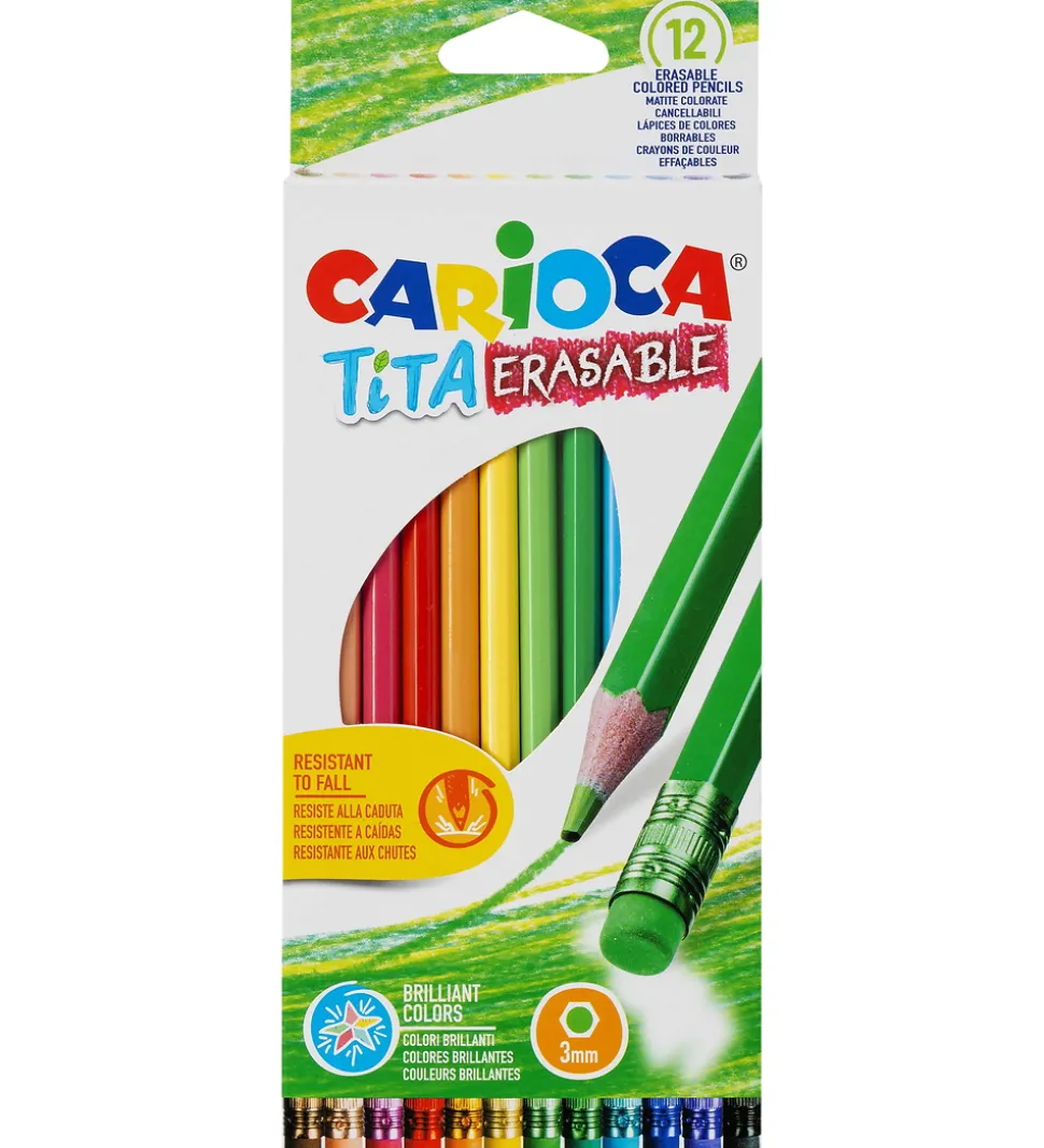 Fantastisk Carioca farveblyanter i en æske med 12 klare farver. Farveblyanterne har et lille viskelæder nederst. De er modstandsdygtige mod fald og lette at spise med en blyantspidser. Farveblyanterne er perfekte til kreative projekter, og kan bruges til at skabe farverige tegninger.