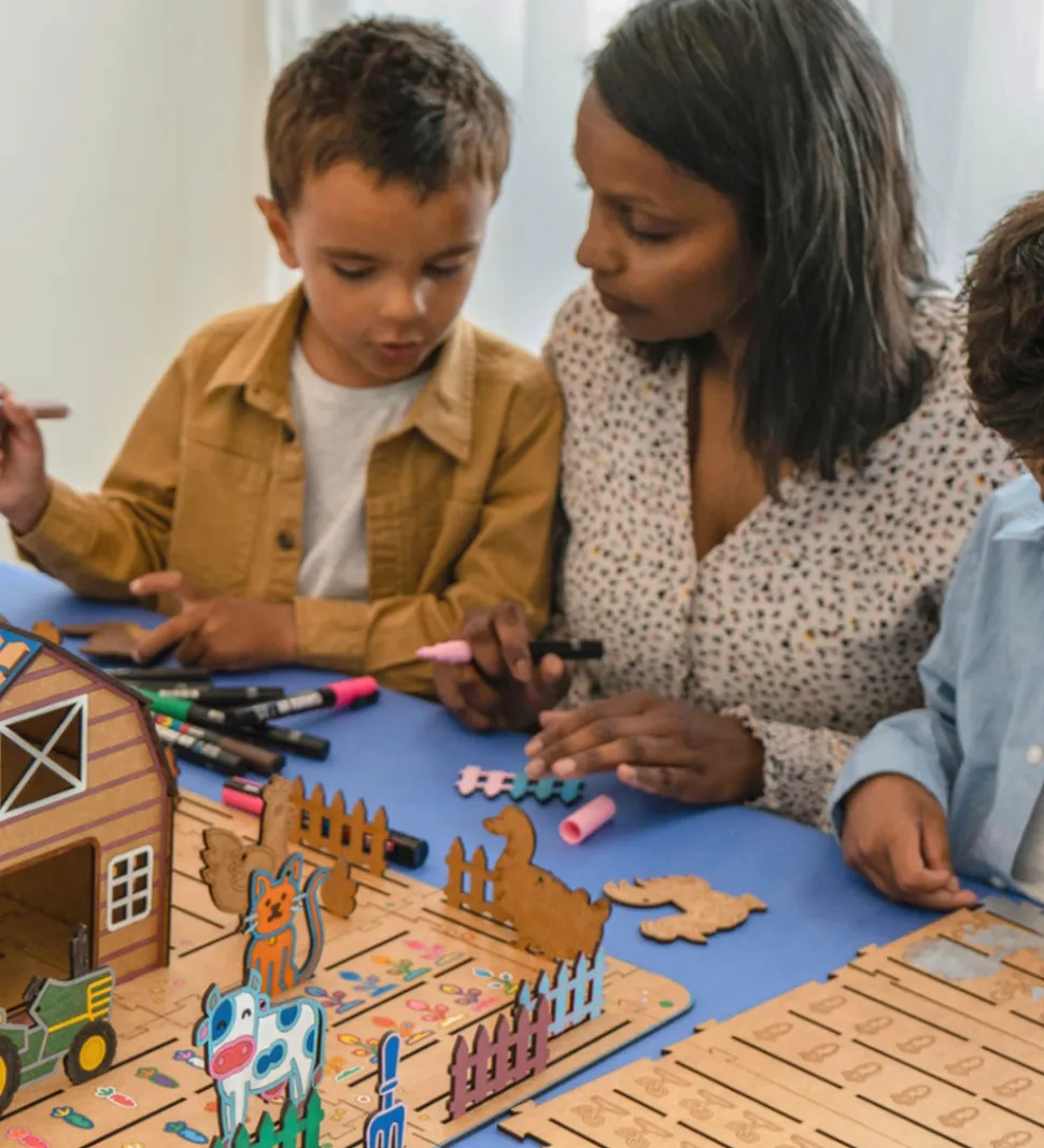 Crateit kreasættet består af i alt 15 figurer, heriblandt bondegårdsdyr, en traktor og tilbehør, der på smart vis kan sættes sammen. Crateit kreasættet er lavet af umalet træ, som kan farvelægges med alle slags tuscher, maling og farveblyanter.