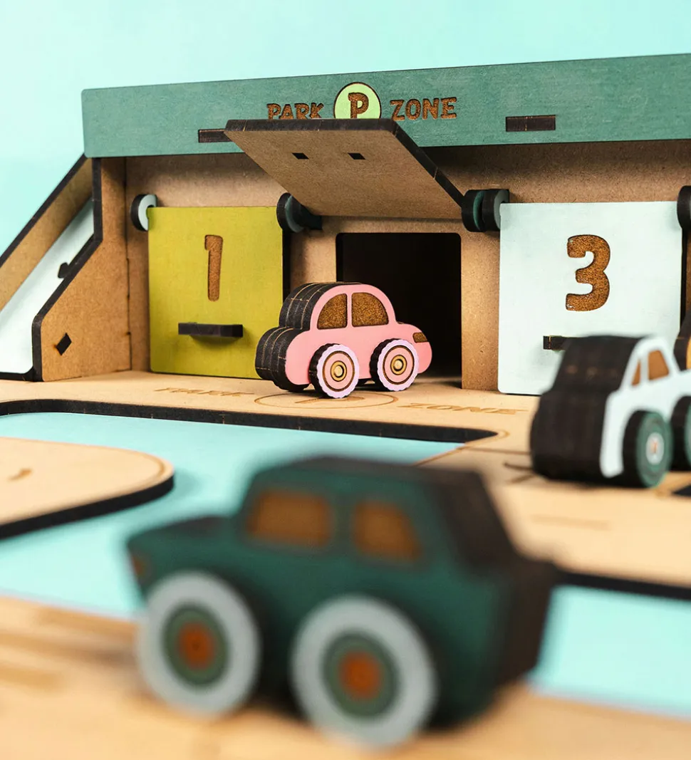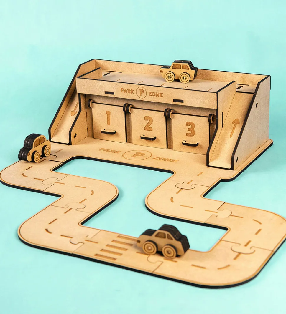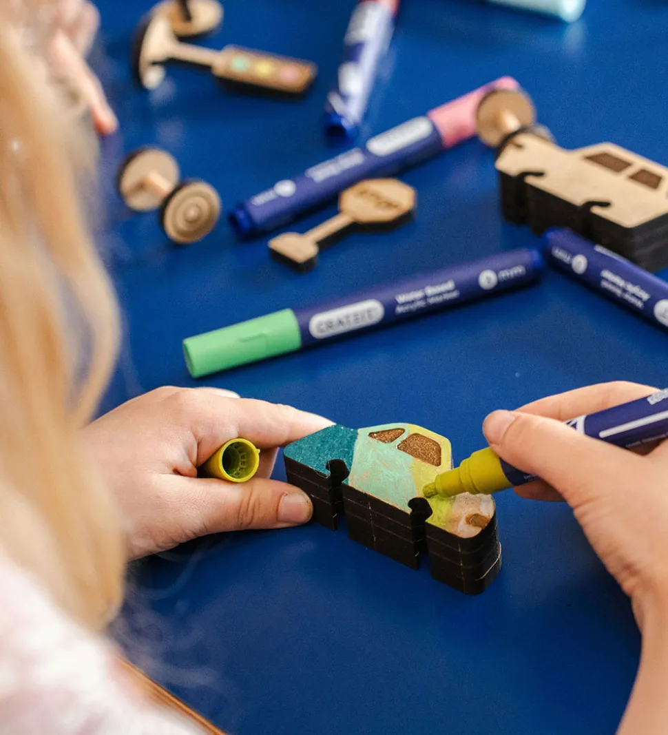 Med Crateit sættet kan du bygge din egen vej med en parkeringszone, samt er træet ufarvet og du skal derfor selv farvelægge det. Det kan farves med alle typer af tusser, maling eller farveblyanter.
