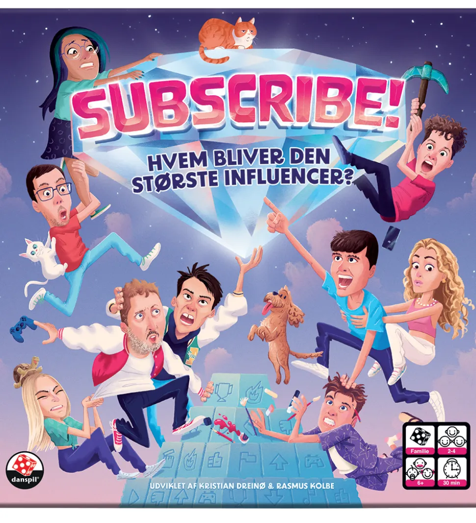 Subscribe er et anderledes brætspil, hvor det gælder om at klatre op ad pyramiden og konkurrere mod Danmarks mest populære influencere om at blive den bedste og vinde diamanten. Brætspillet kombinerer det fysiske brætspil med en gratis app, der bringer dig ind i influencernes verden. Spil med Jas og Mika, RobinSamse, Lakserytteren, Alex og Nellie, Comkean og Judex.