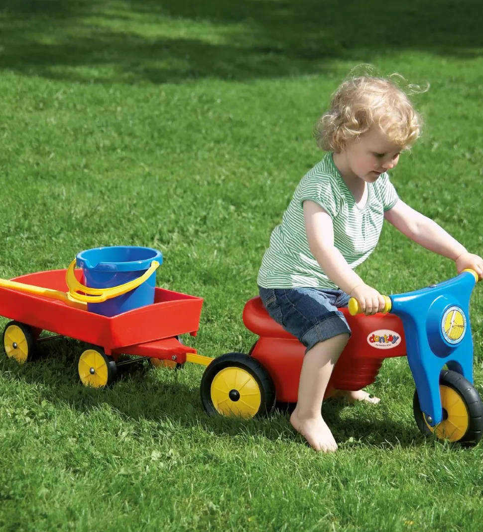 Dantoy motorcyklen er fremstillet i solid plastik og har tre gummihjul, så scooteren kan bruges både inde og ude. På fronten har scooteren en påsat forlygte og på sidderne er der klistermærker med “Dantoy” skrevet på.