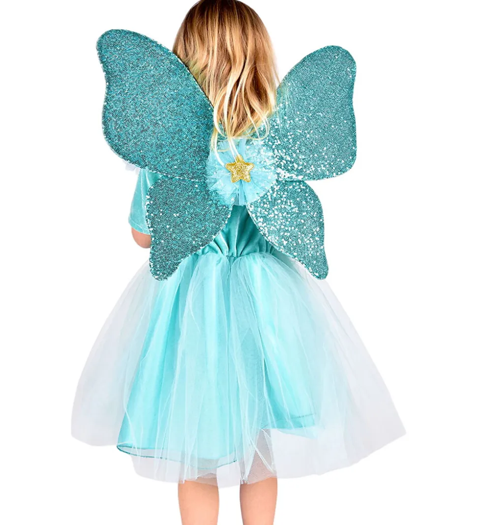 Den Goda Fen udklædningen består af en kjole med tylskørt og pailletter, vinger med pailletter samt en tryllestav med en guldstjerne.