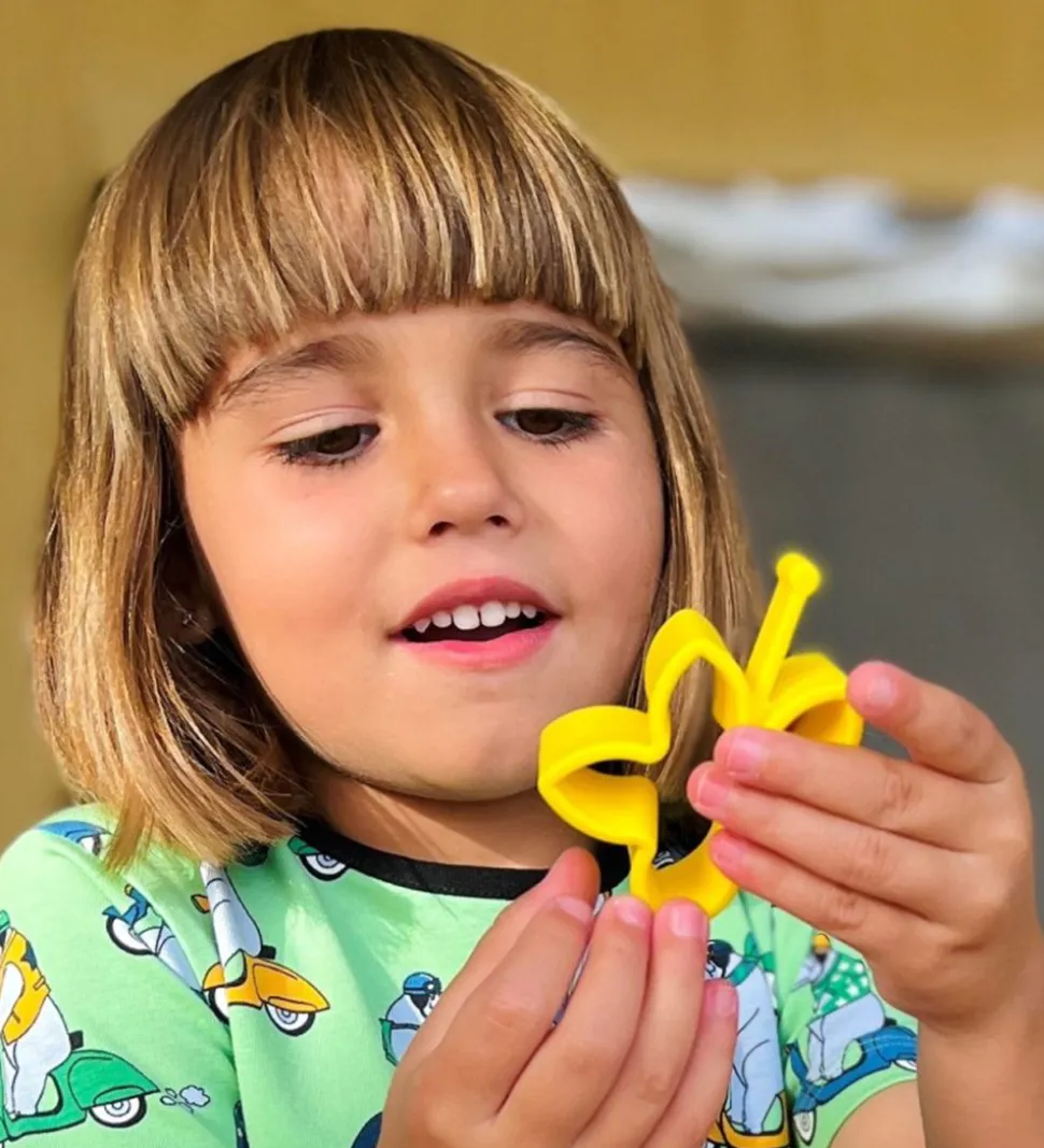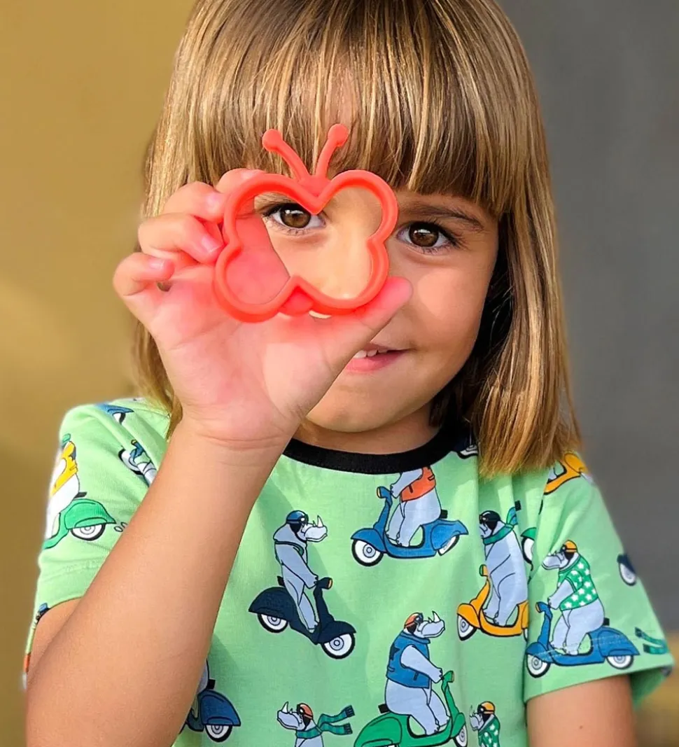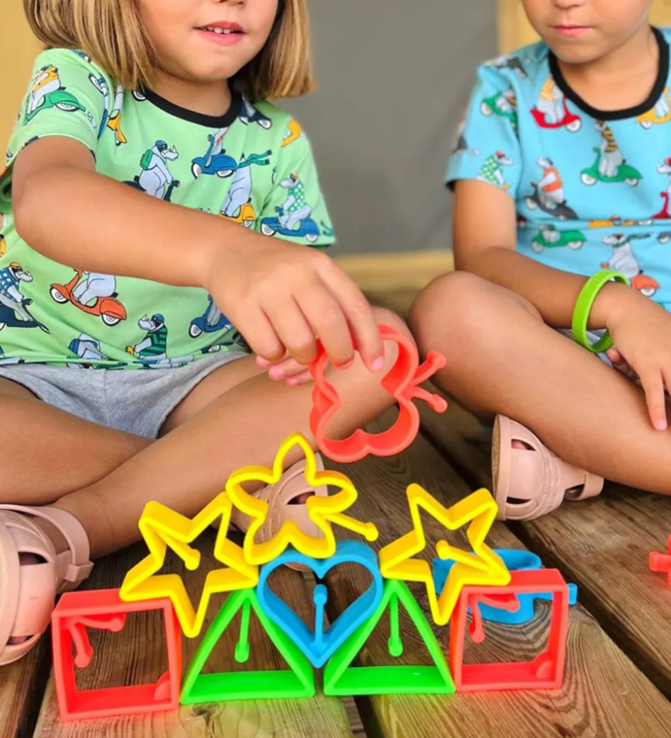 Dëna aktivitetslegetøjet har forskellige former og er i blødt silikone, så de forskellige former kan “flippes” og tage en ny form. De kan også stables og leges med efter fri fantasi. Aktivitetslegetøj er fri for BPA, PVC, latex og ftalater.