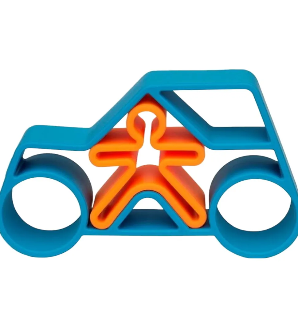 Smart Dëna bidelegetøj, som består af en blå bil og en orange figur, der passer ind i bilen.