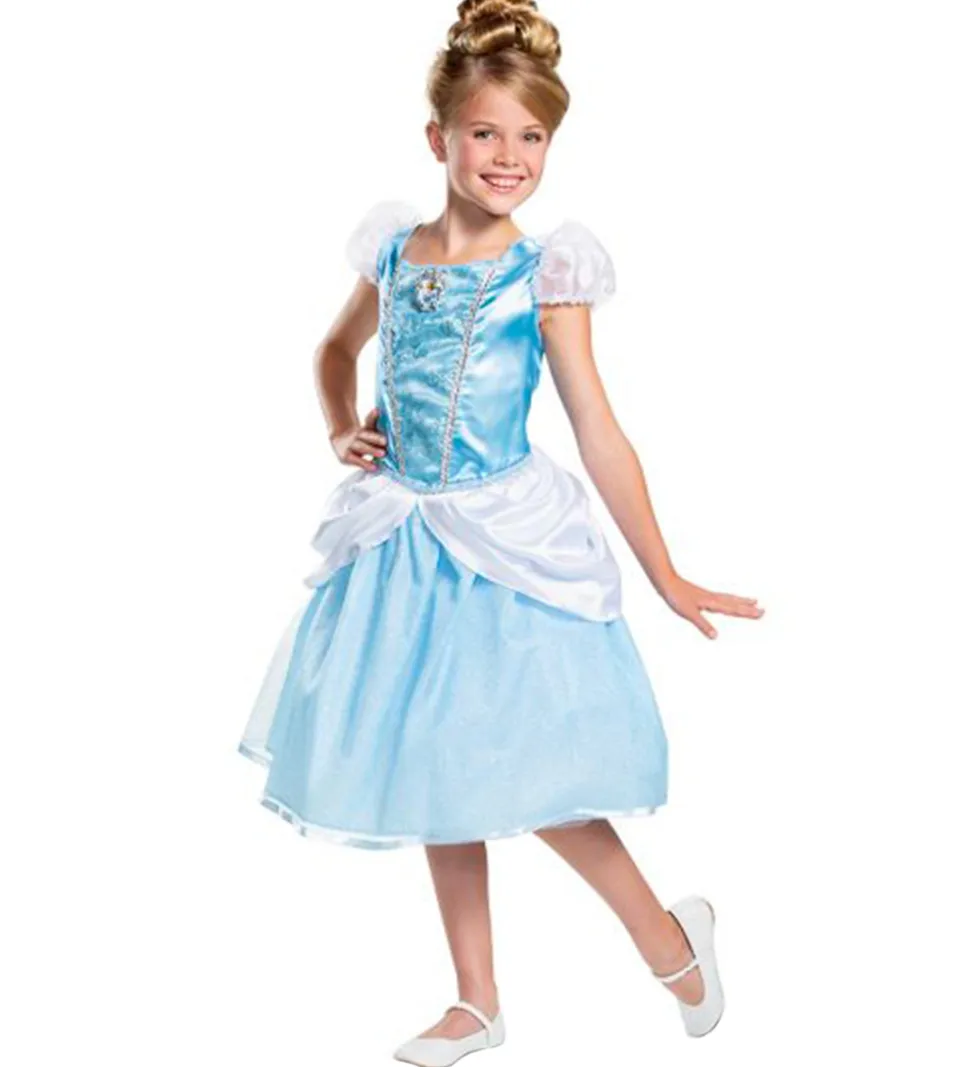 Fin Disguise udklædning af Askepot. Udklædningen består af en kjole i blå med sølv detaljer, samt hvide skuldre og et hvidt skørt.