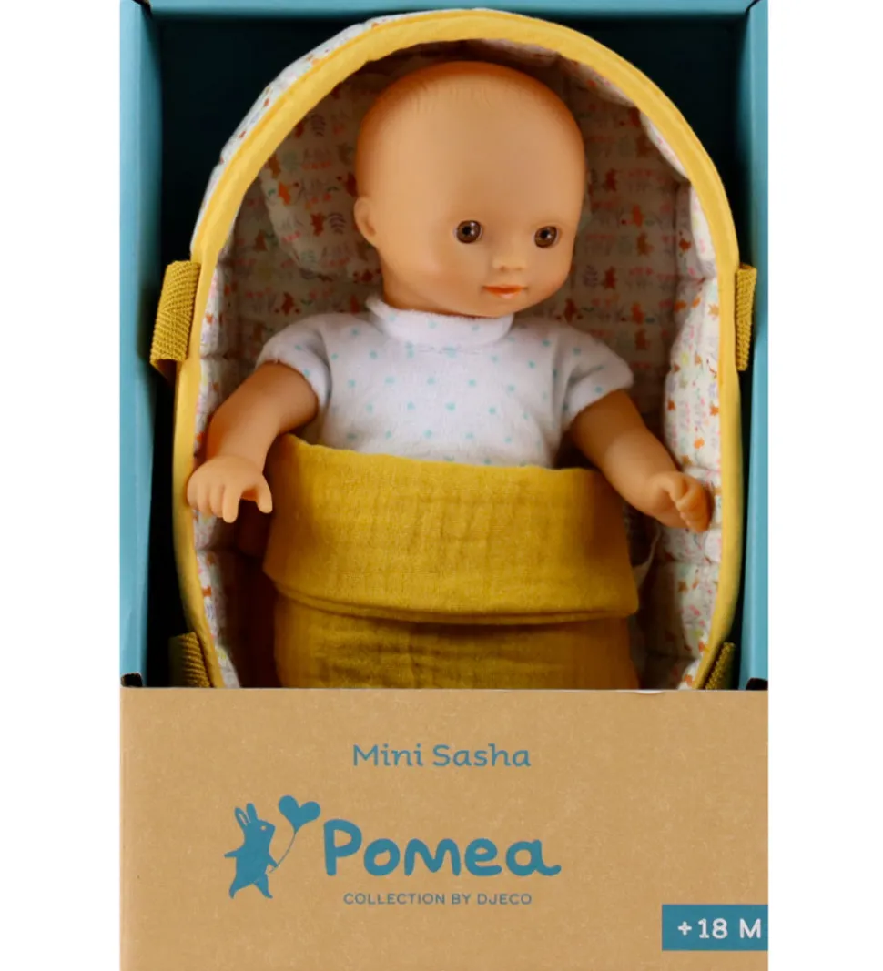 Sød Djeco dukke med tilhørende dukkelift i et gult farvetema og med et fint print med kaniner og blomster.
