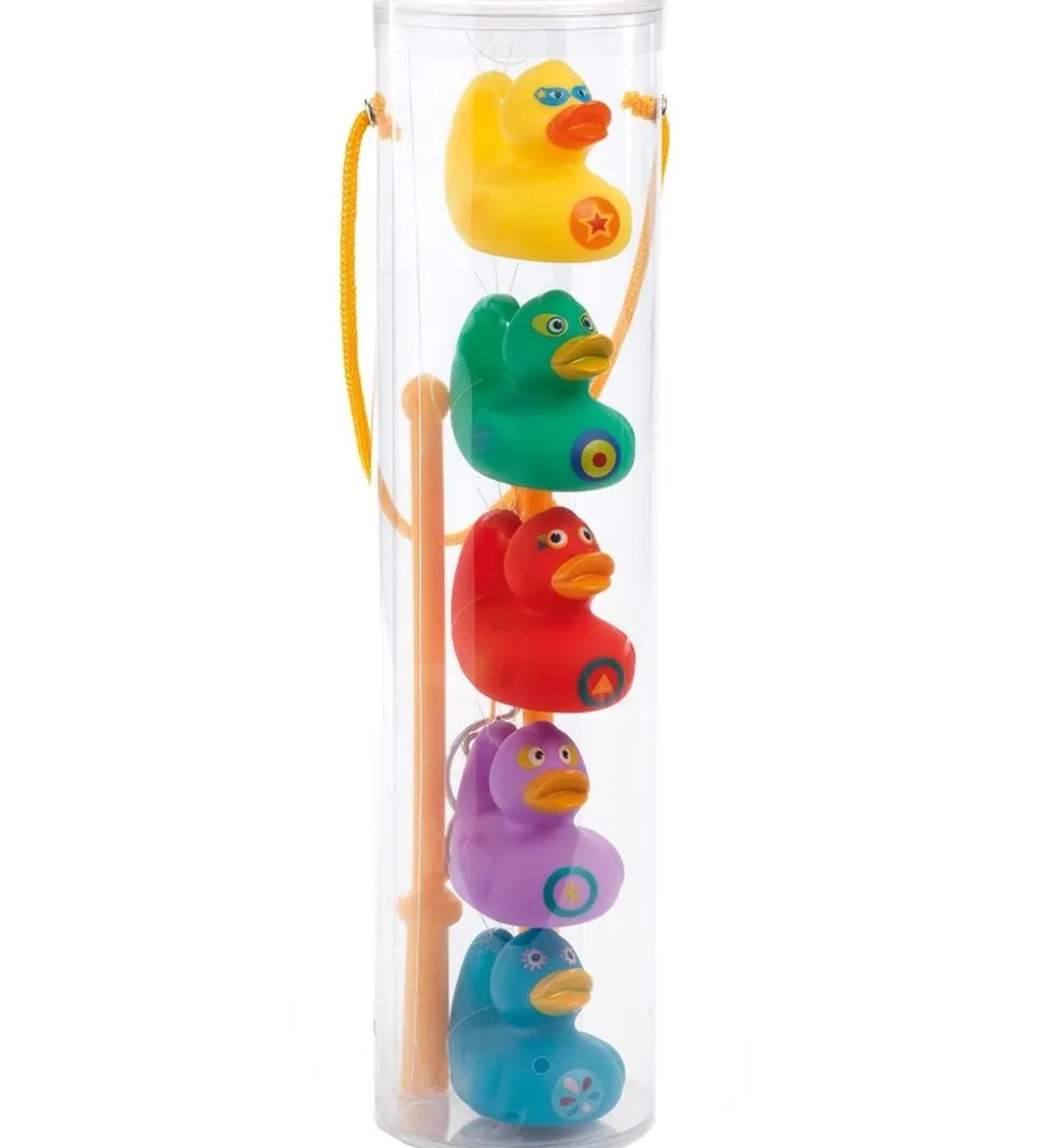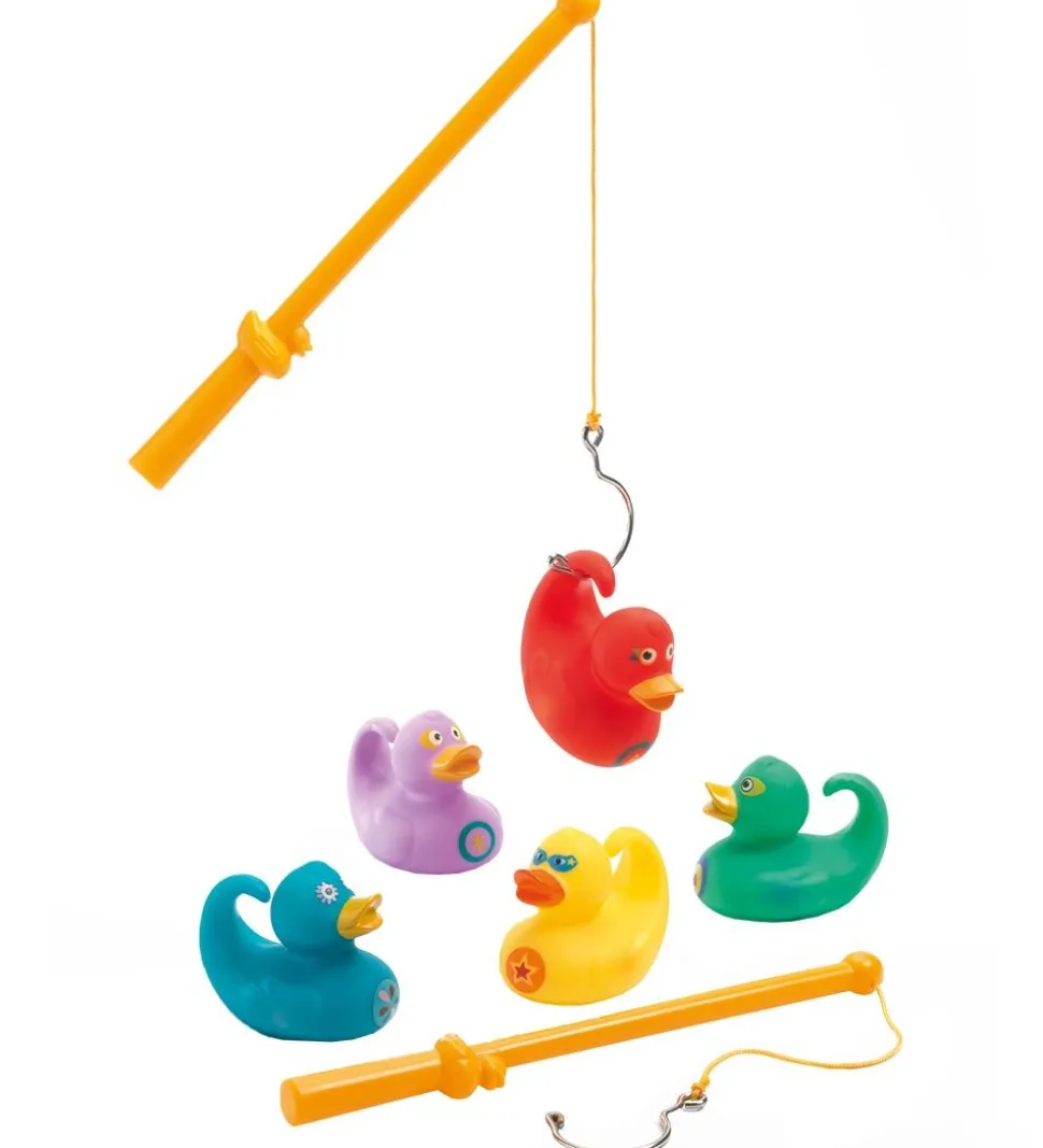 Fiskespillet består af 5 badeænder, som kan flyde i badekaret eller badebassinet i haven, og det gælder om at fiske ænderne op af vandet med en fiskestand. På undersiden af hver and står der et tal fra 1 til 3, så man spille med, at man får point for de ænder, man fisker i land.