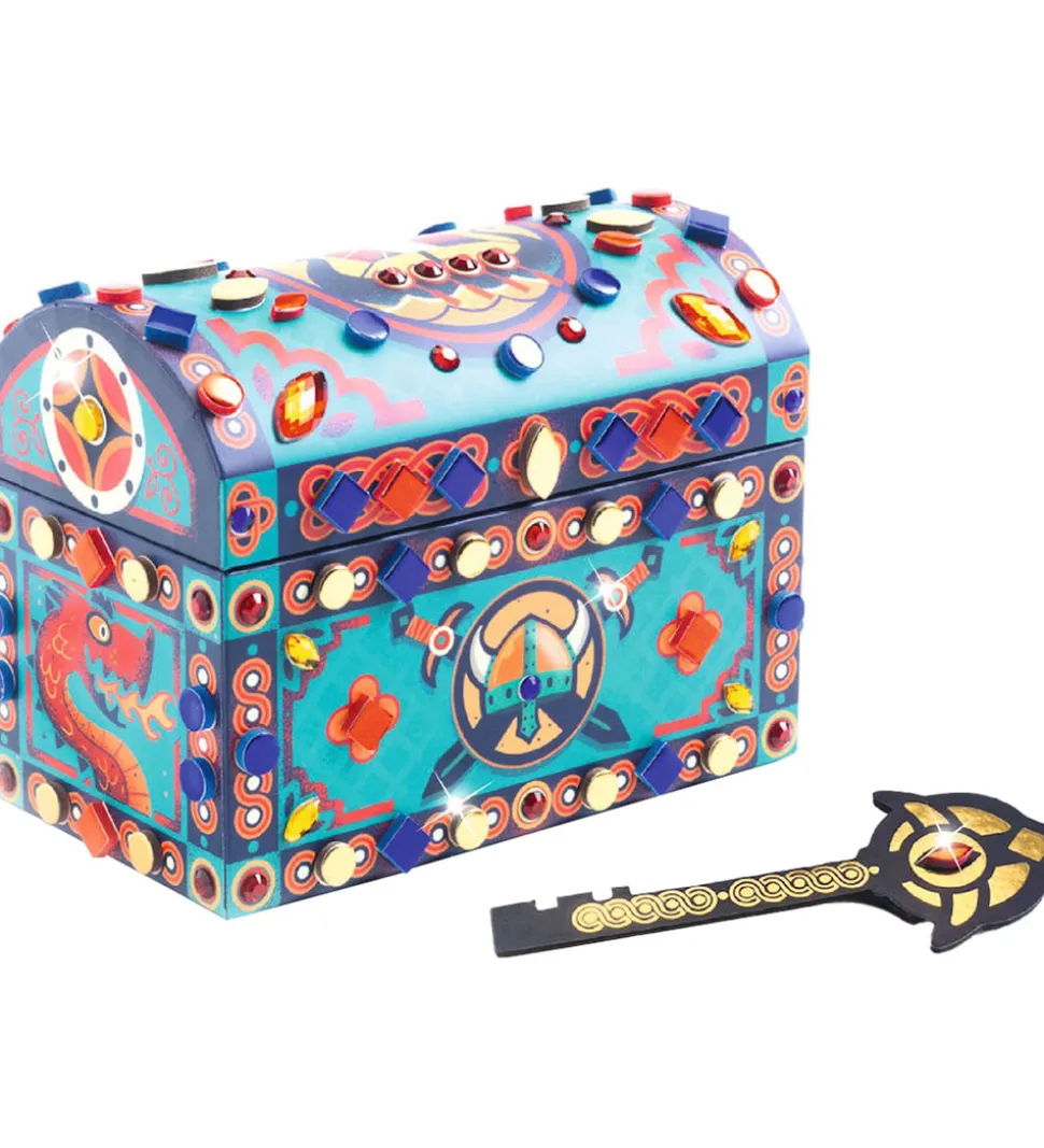 Farverigt Djeco kreasæt består af en kiste, som man kan dekorer med selvklæbende mosaikker og klistermærker af ædelsten. Kisten har en hemmelig bund som kan åbnes med nøglen, så man kan gemme alle sine værdifulde skatte.