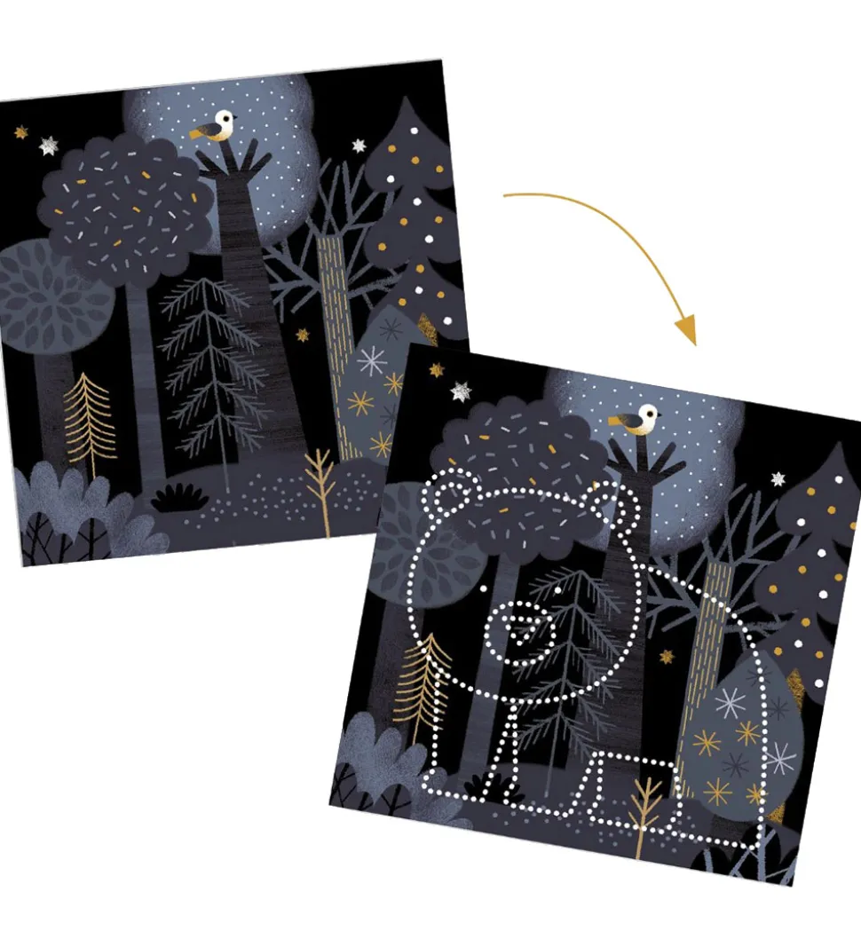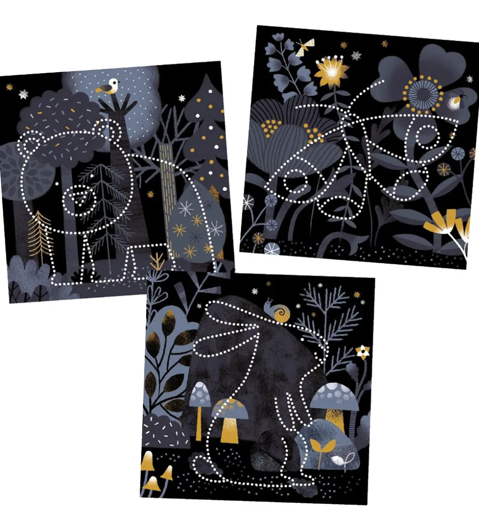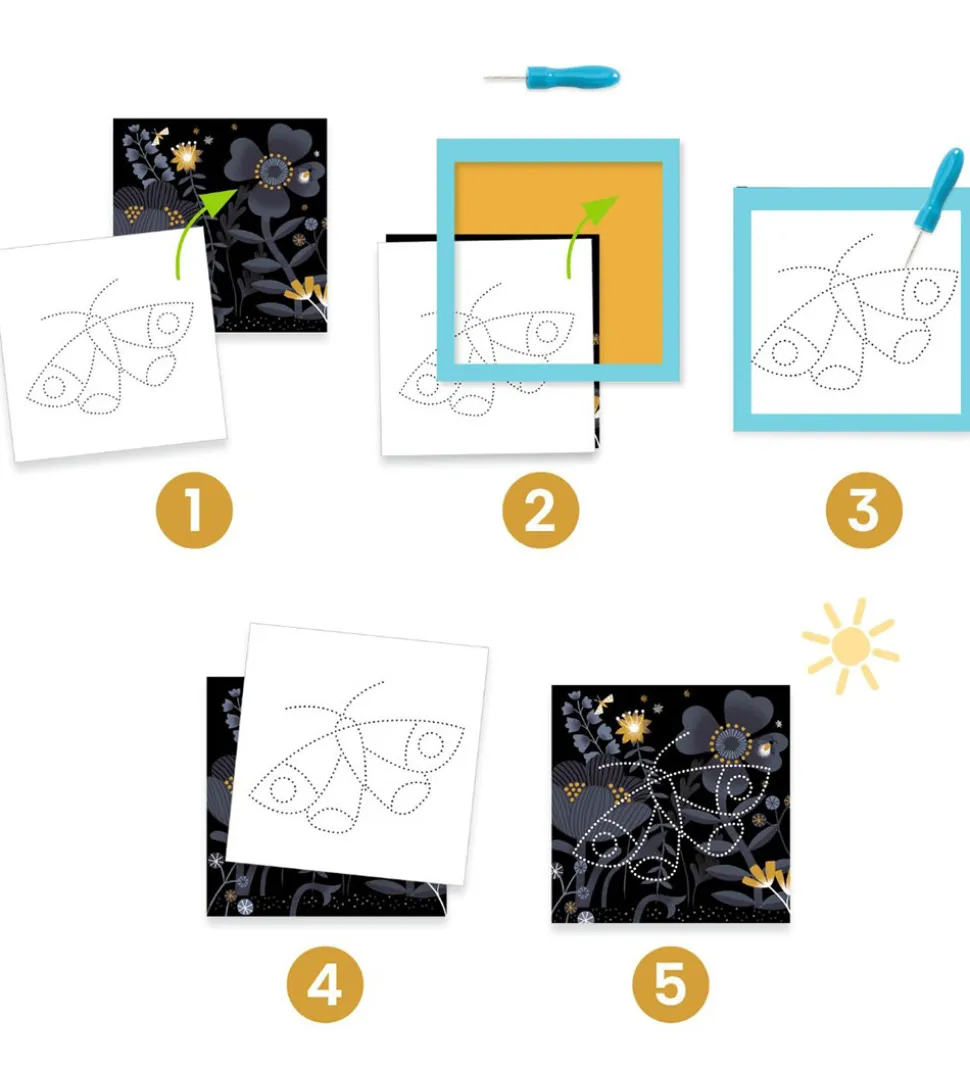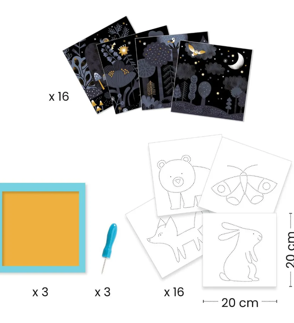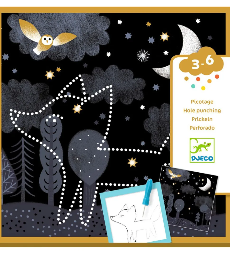 Djeco kreasættet tillader børnene at lave smukke kunstværker ved at placere en af de flotte baggrunde på det tykke skum, hvorefter man kan prikke huller med redskabet. Man kan følge modellerne, så man får et flotte billede af dyr.
