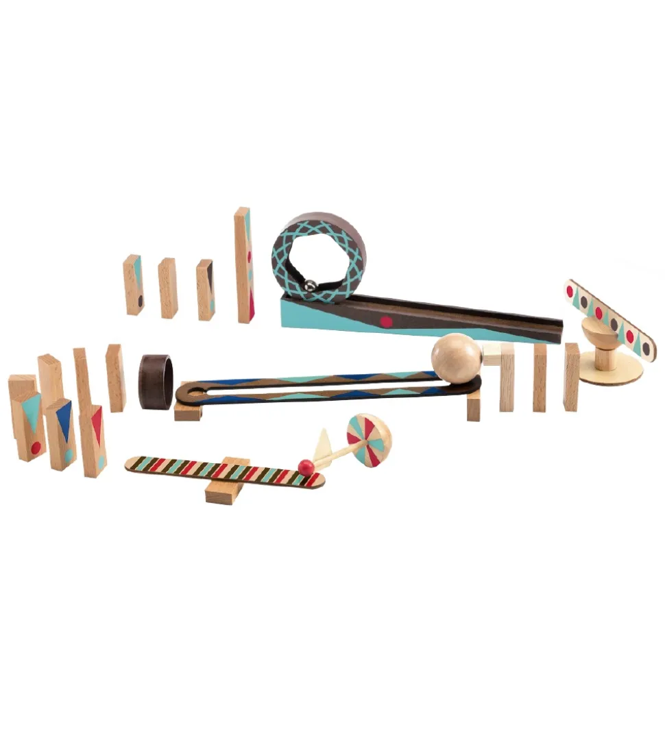 Djeco kuglebanen består af 28 dele, som kan sættes sammen på et utal af måder. Spillet indbyder til mange timers sjov og opfindsomhed med at konstruere en bane og se, hvordan der bliver skabt en kædereaktion.